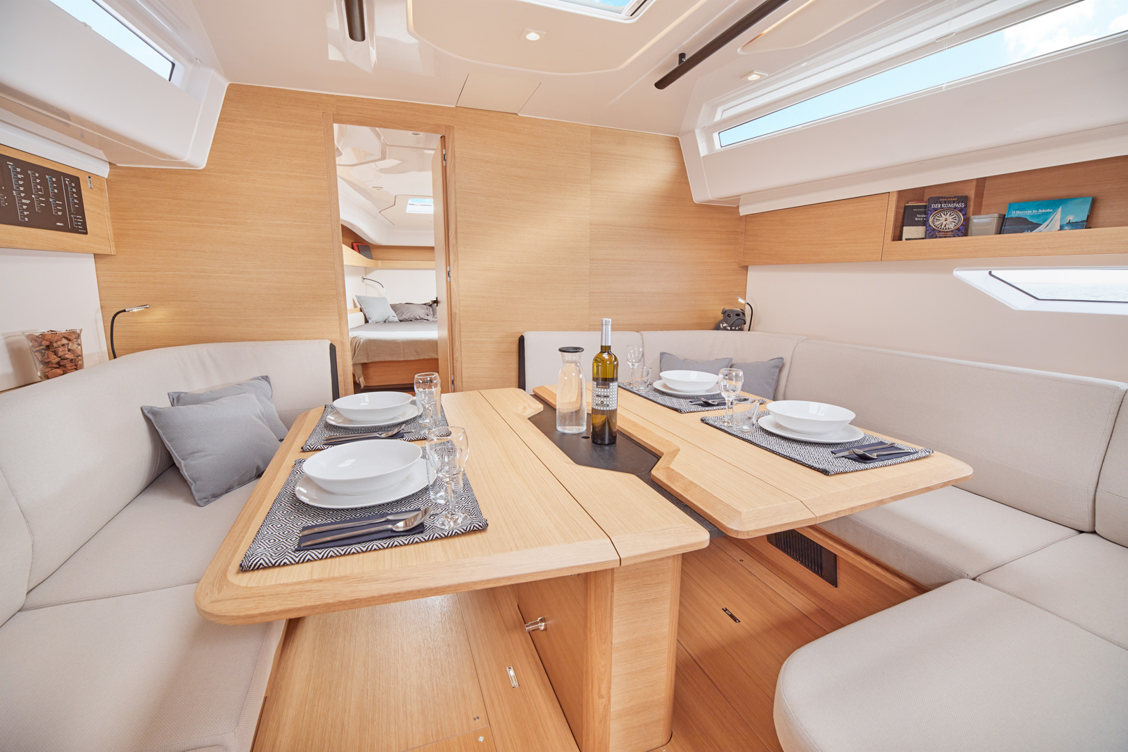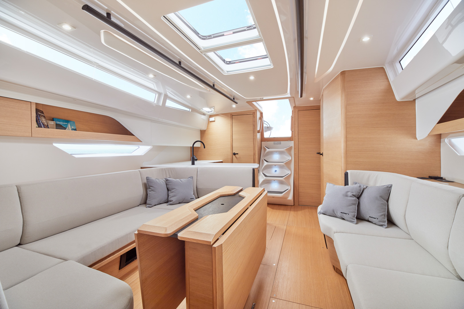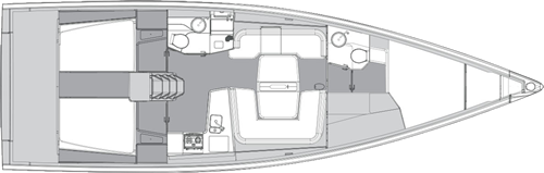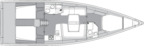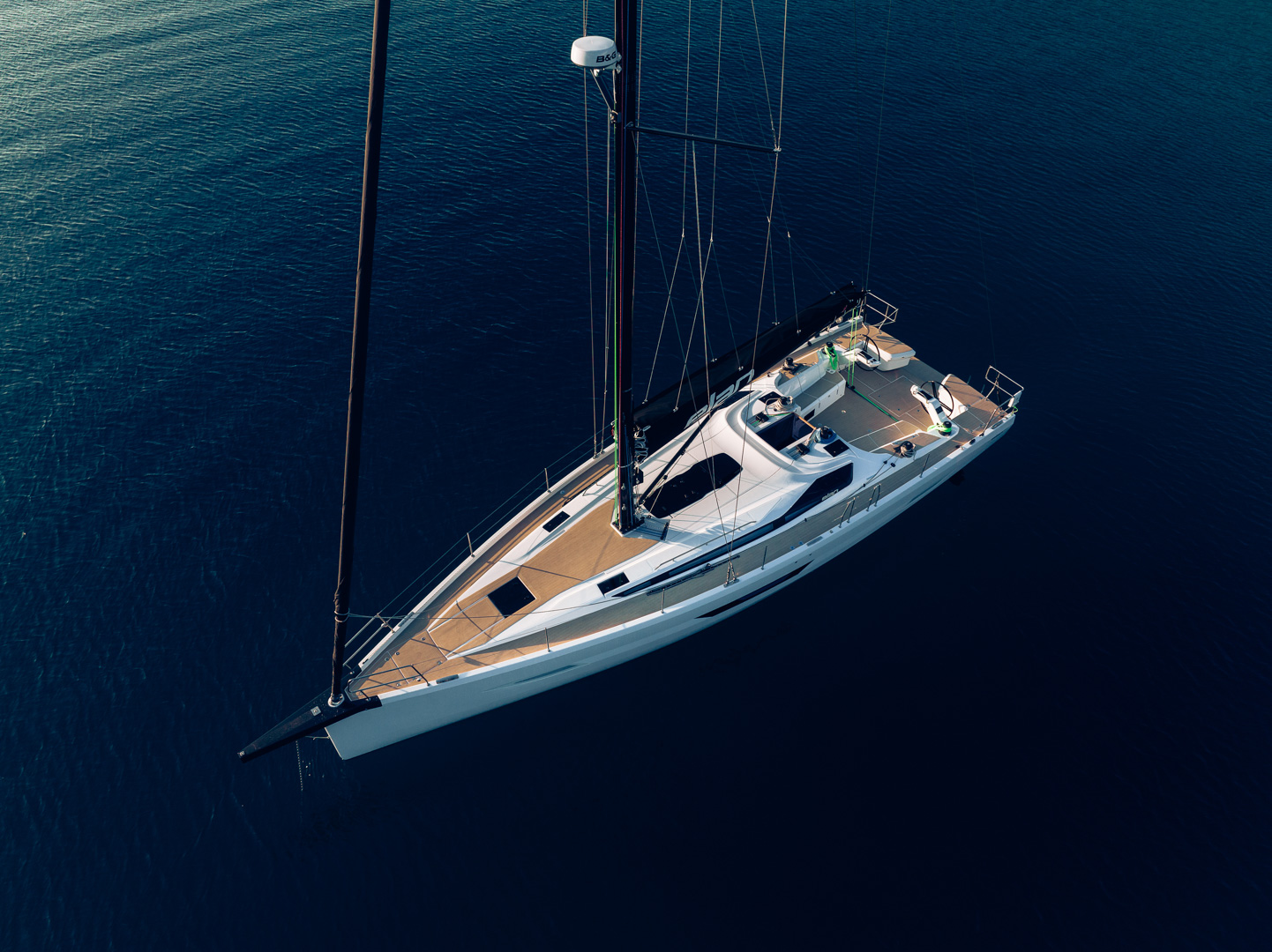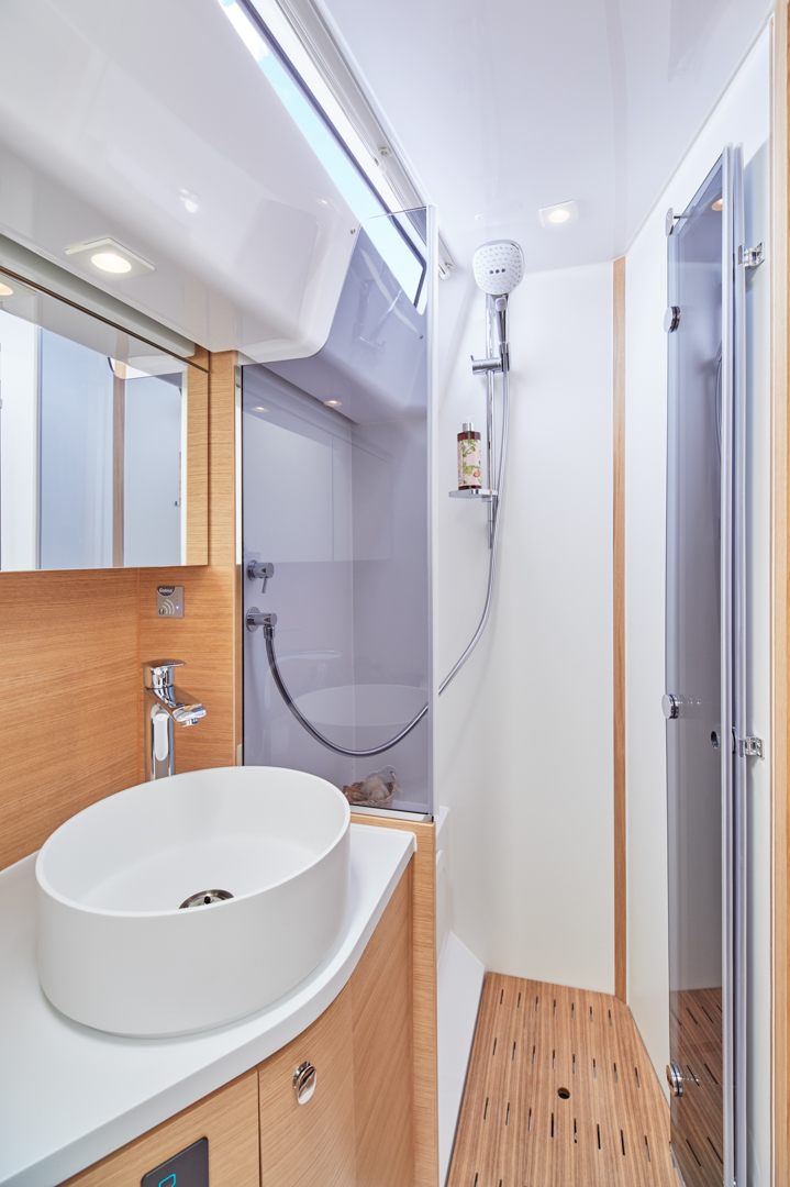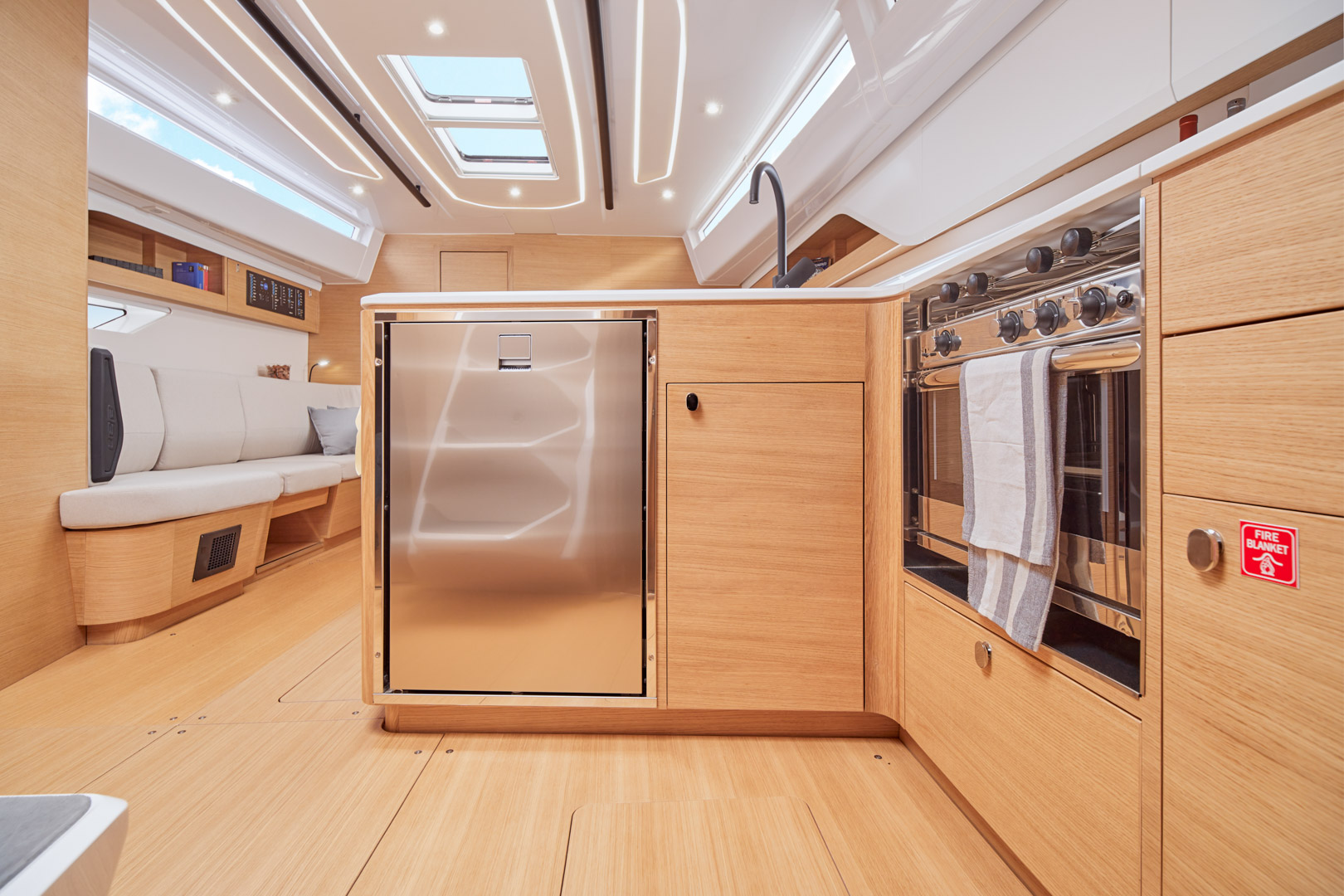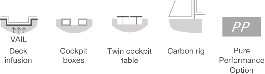 Optional storage boxes with a grill, sink and a refrigerator are available, as well as two sizes of bathing platforms. Along other lockers, mainsheet ropes are fed to dedicated boxes on the cockpit sides.