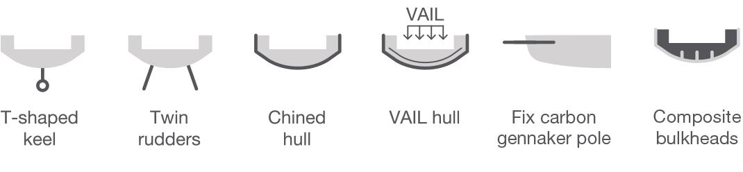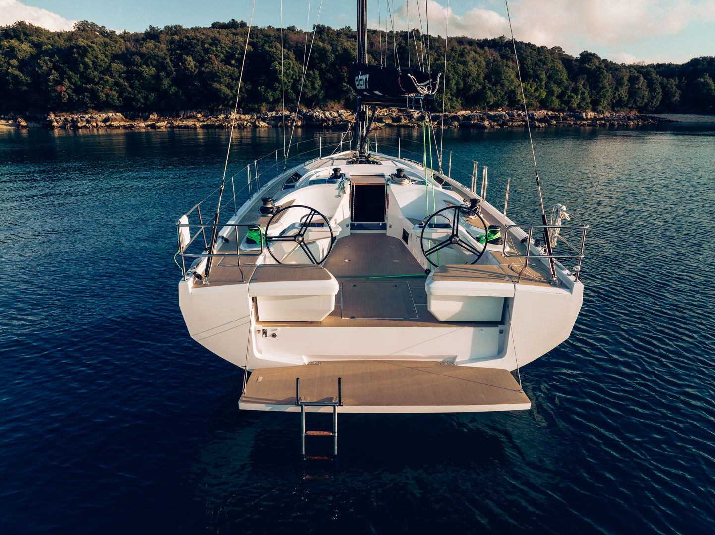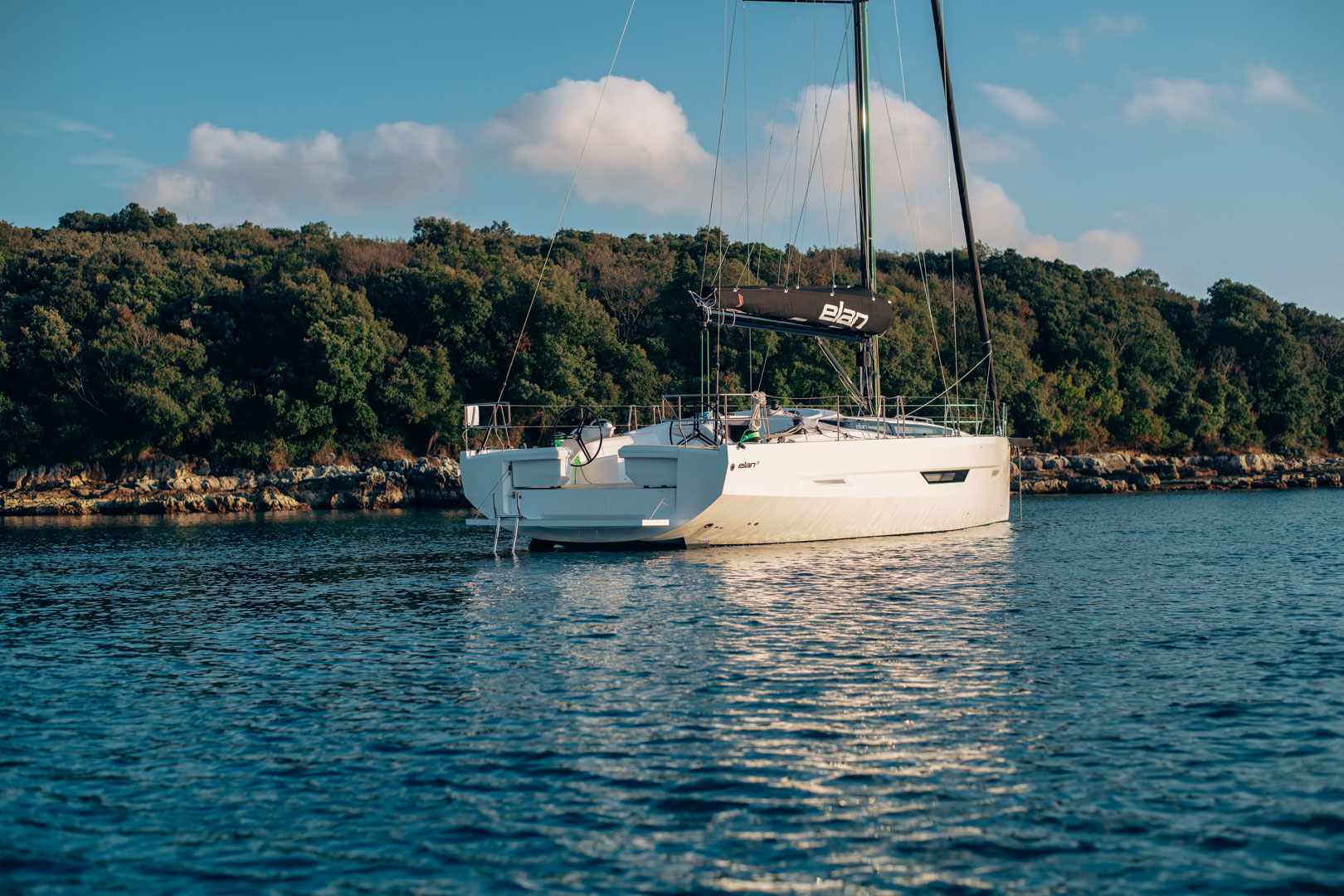 Elan E6 was created for skilled and demanding sailors, that also want a high level of comfort and cruising advantages. This represents a return to Elan’s DNA, with a big boundary push of her performance and aesthetics. The E Line is known for the active chine design, twin rudders and T-shaped keel, but the team at Elan and Humphreys Yacht Design also fine-tuned the new hull design to push the performance in various sailing conditions and all points of sail beyond what would be typically considered feasible for a yacht of this type.