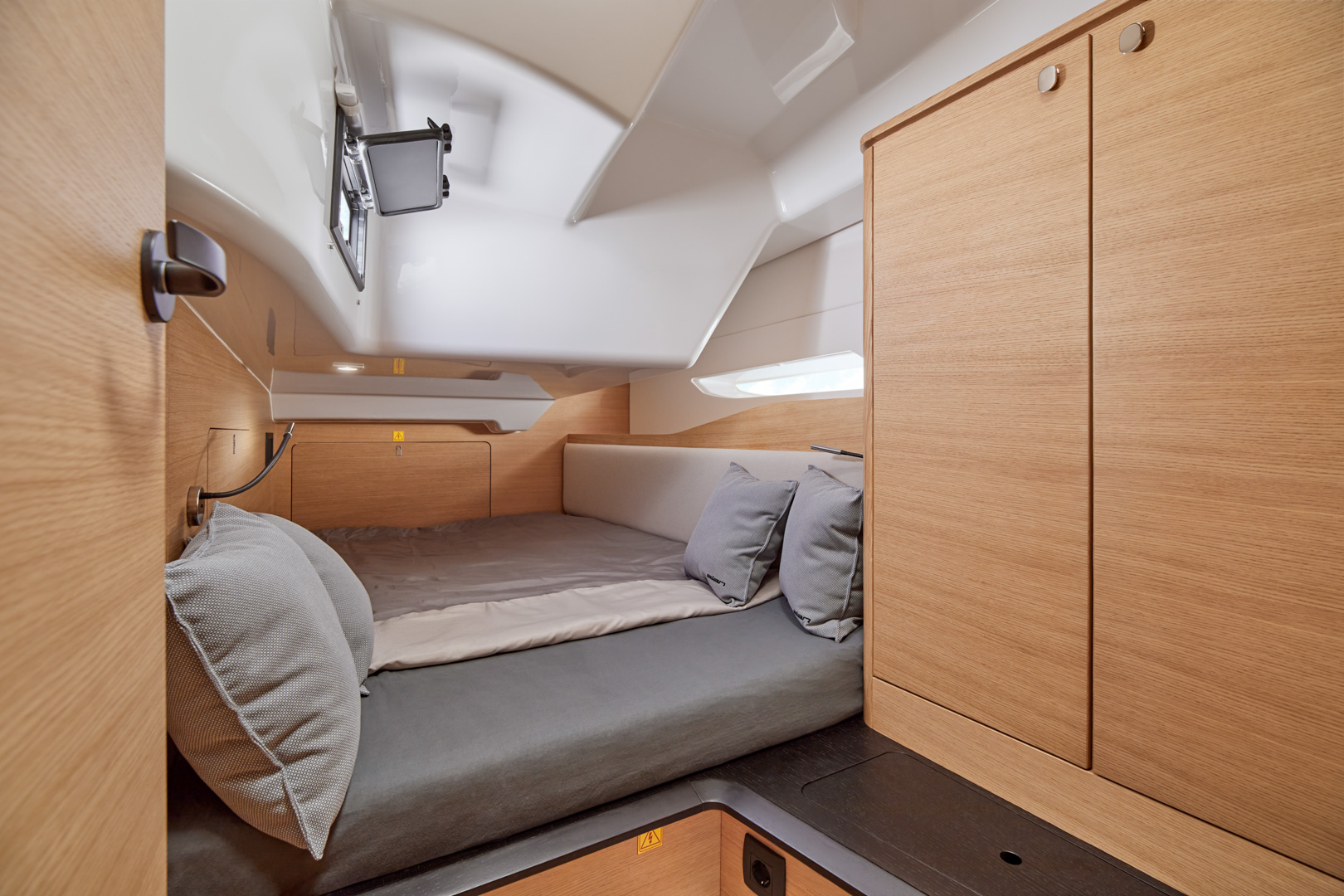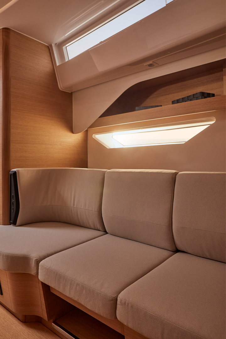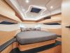 The creative form is brought alive by the natural oak veneered interior and enriched with solid wood finish. Optional performance okoume furniture keeps the weight down, while not distracting from the boat’s luxurious look and feel. The carefully selected colour-scheme complements the yacht’s beautiful lines, flowing from the rear cabins all the way up to the master cabin’s island bed, invoking the feeling of elegance in motion