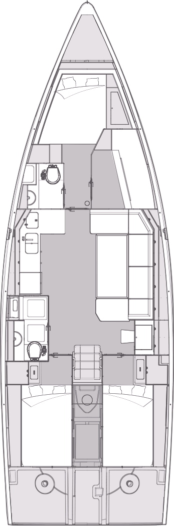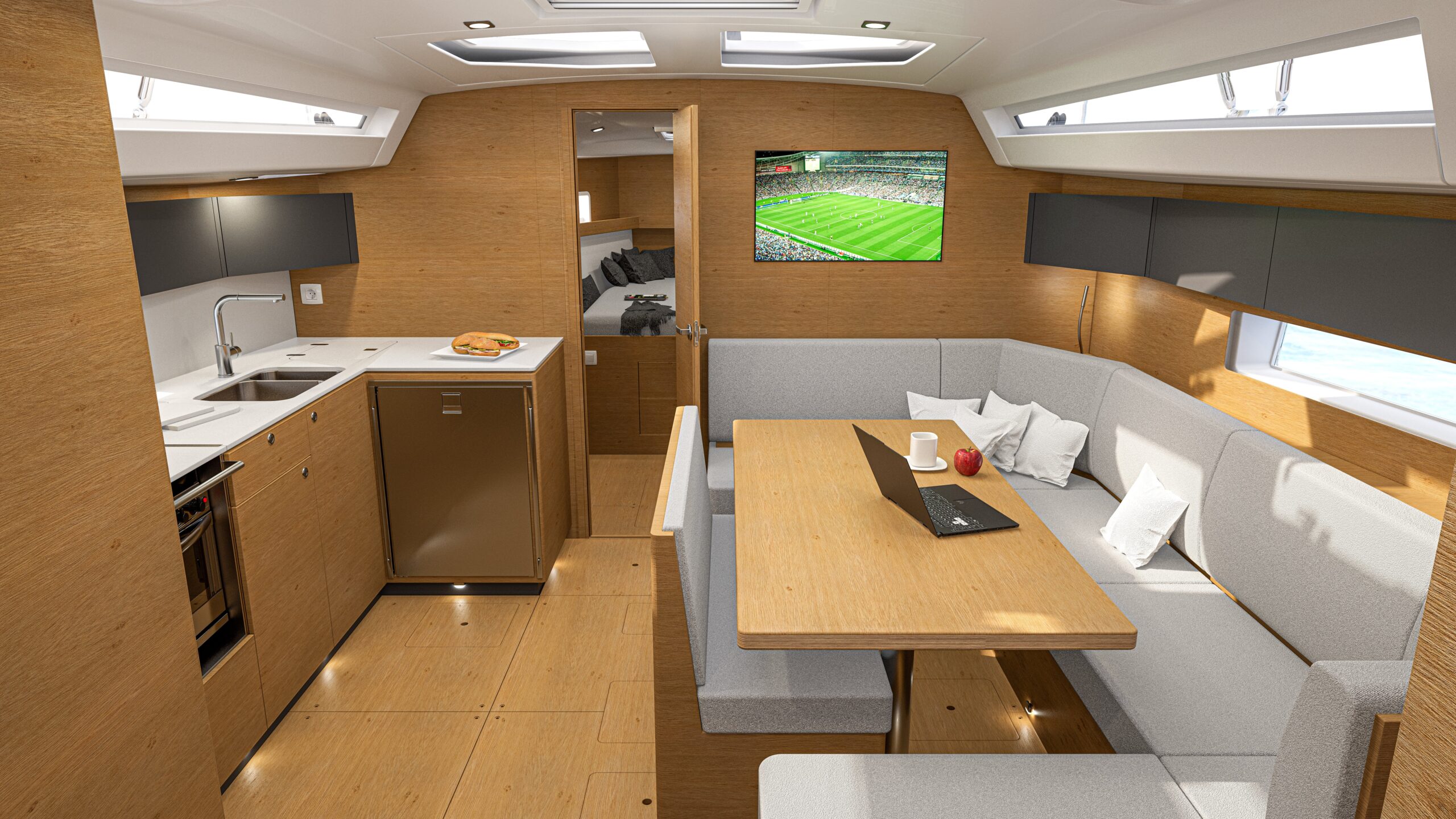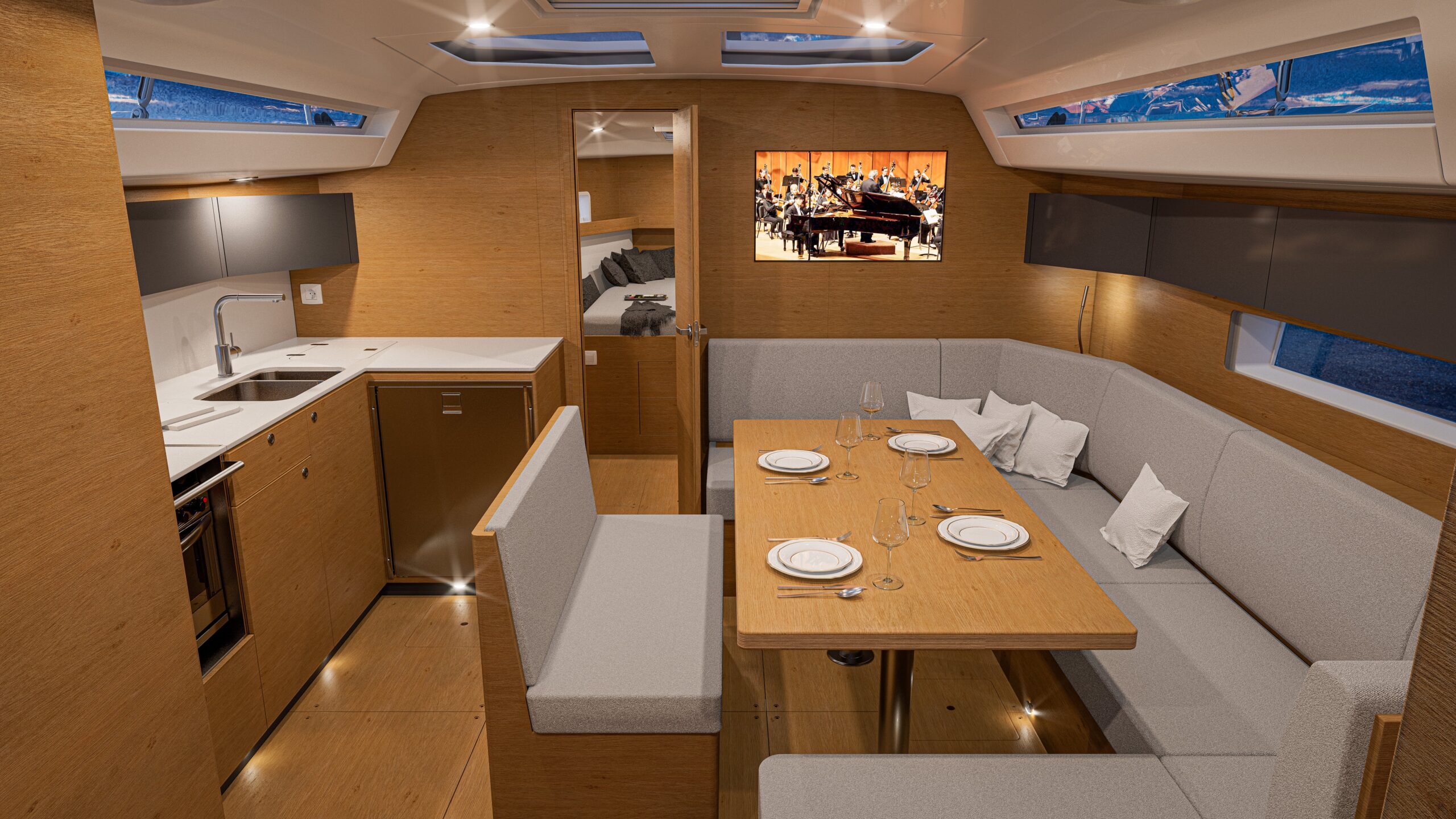 Boasting a modern wide-beam hull, the yacht offers much more space than previous models. Due to the continuing tradition of a raised coach roof, what we call a “semi-deck-saloon”, it holds its own against competitors as well.