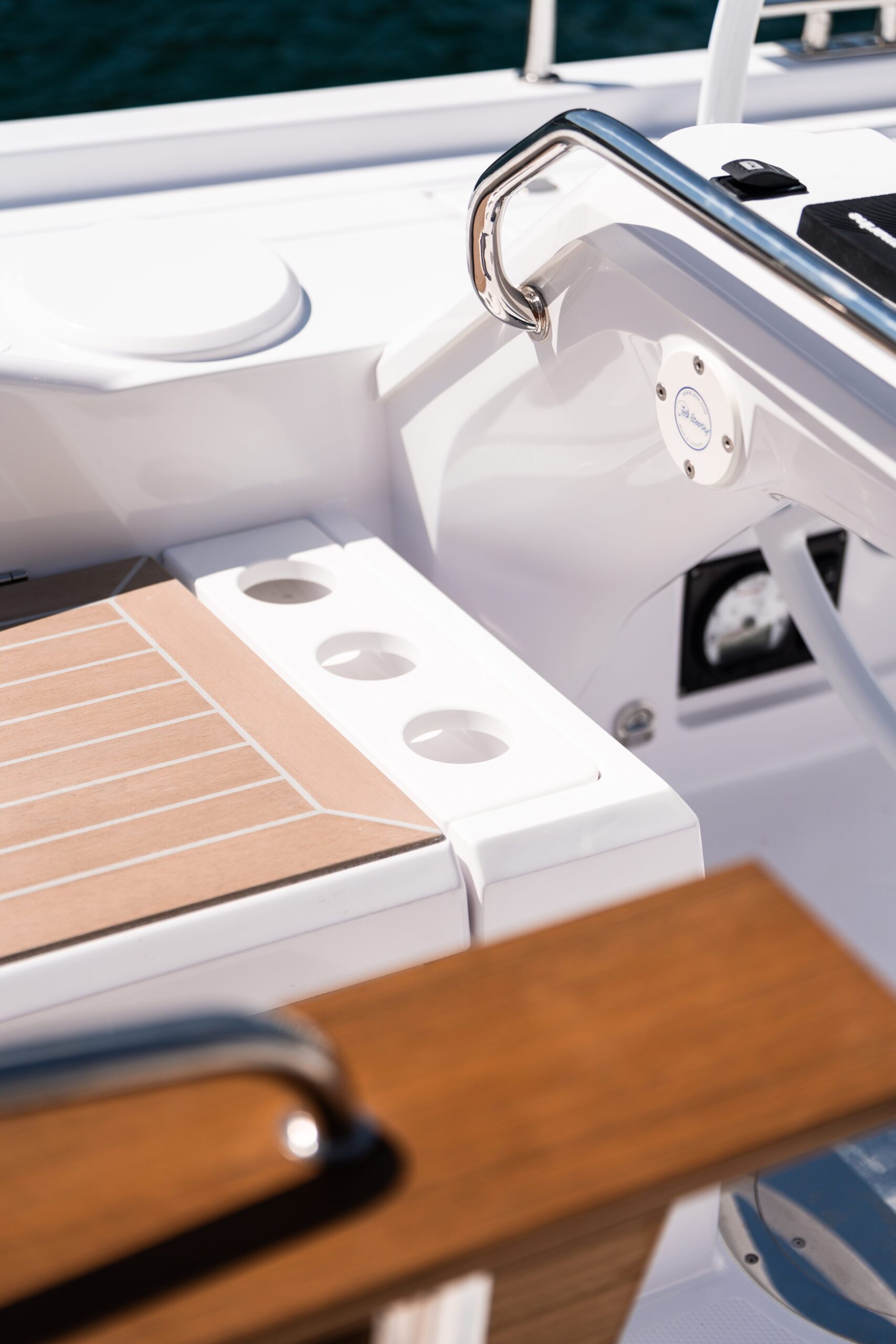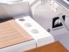 Integrated into the deck are two transom boxes, which offer an extended seating area for the skipper and guests and can hold both a grill and a refrigerator.