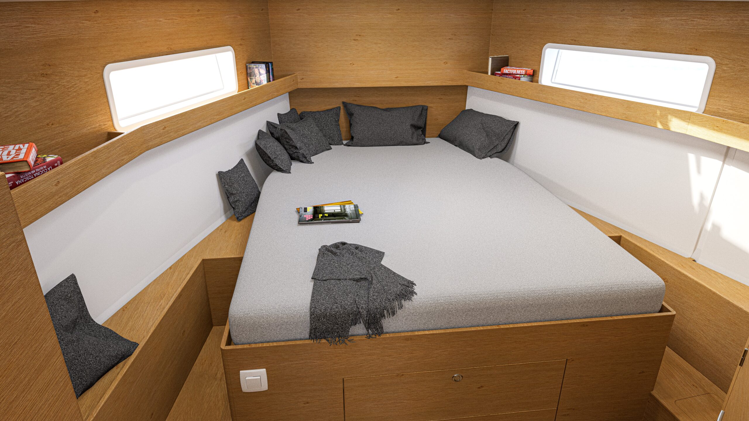 Owners can choose between three or four-cabin versions. The three-cabin version includes an en-suite with an island bed and a spacious head with a separate shower, and the four-cabin version adds a cabin with bunk beds, perfect for families or groups of friends.