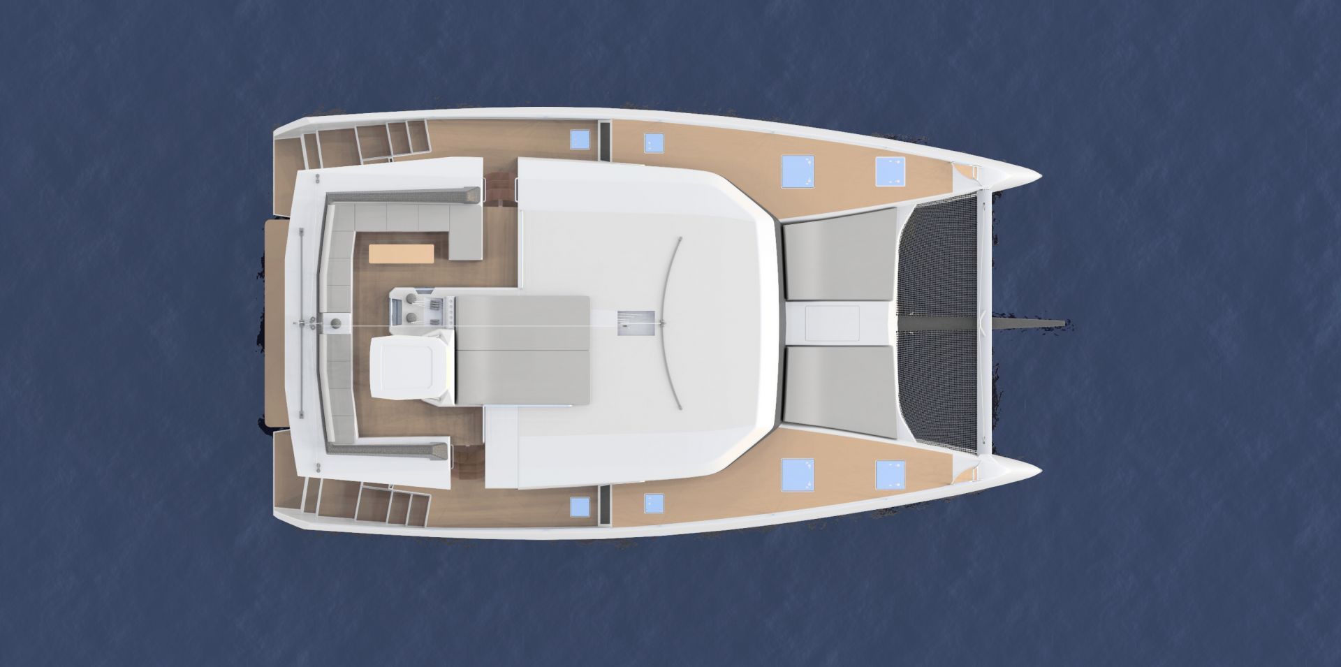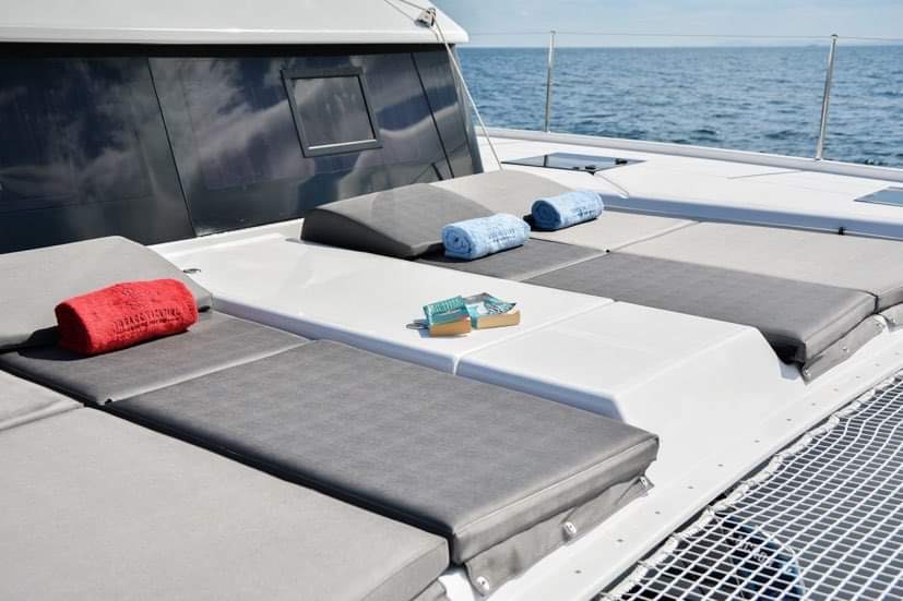 At the bow, there are two double sunbeds just in front of the coachroof. Additionally, there are two small trampoline sections just aft of the cross beam.