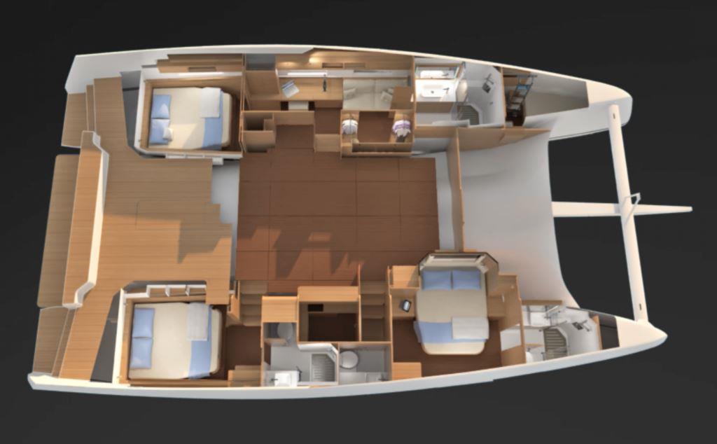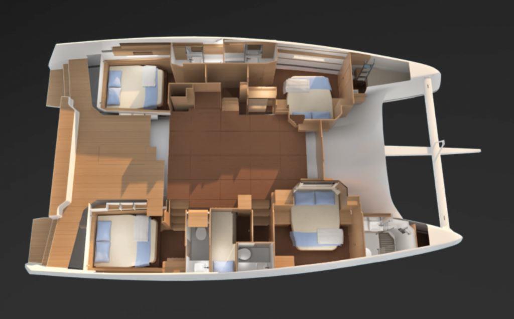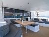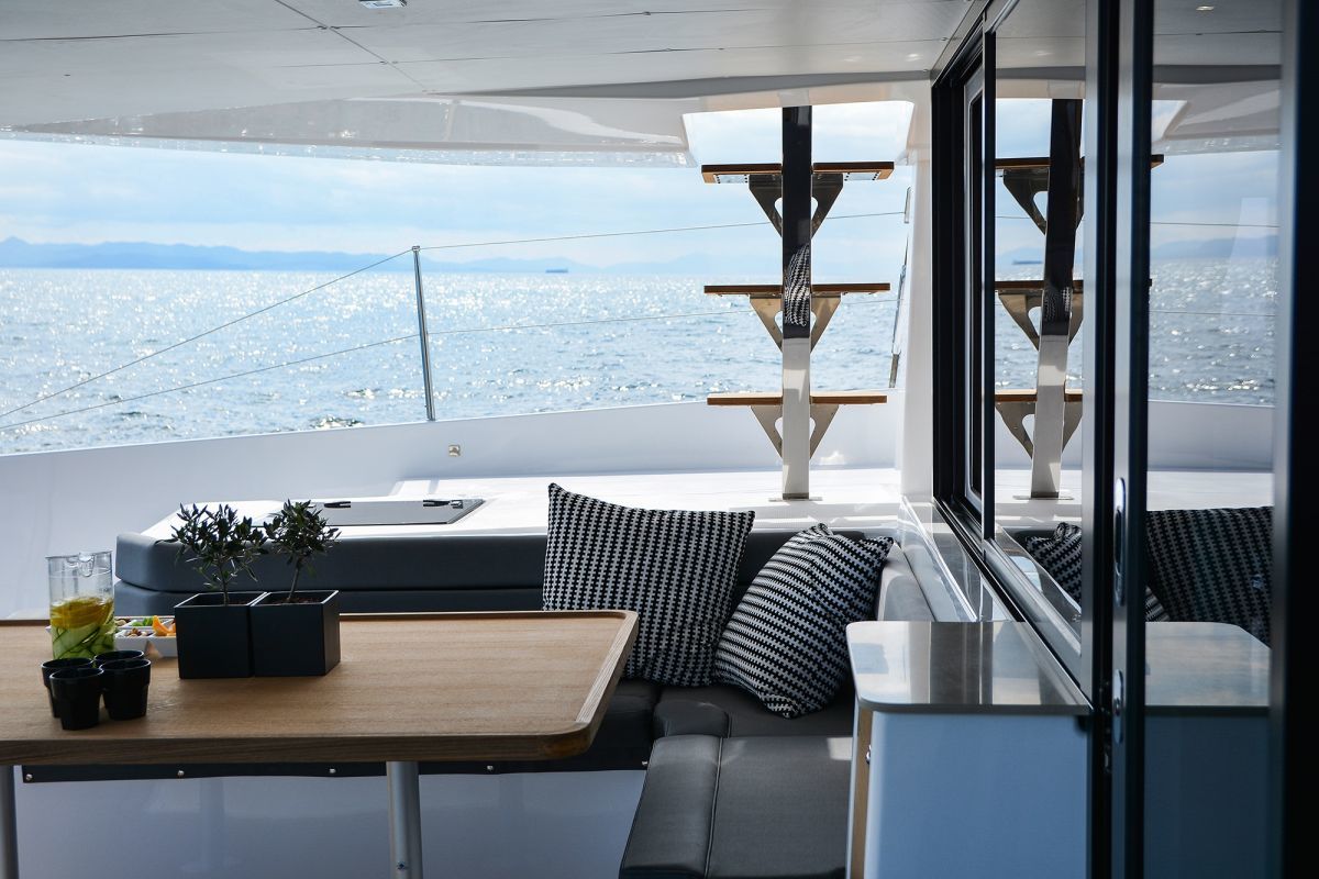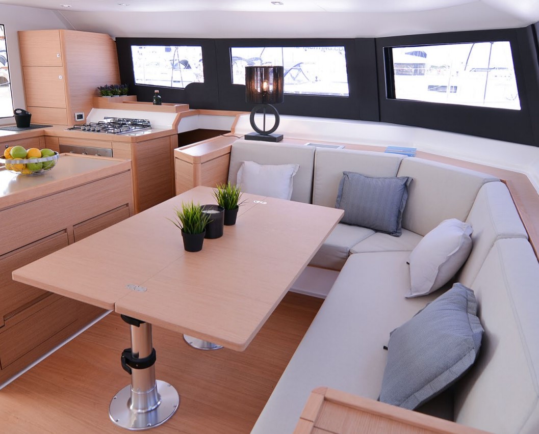 The space below deck is unique in her class. The cat Design Team has implemented an inverted saloon layout featuring the galley towards the bow of the boat, ensuring optimal utilisation of the catamarans interior entertaining area.