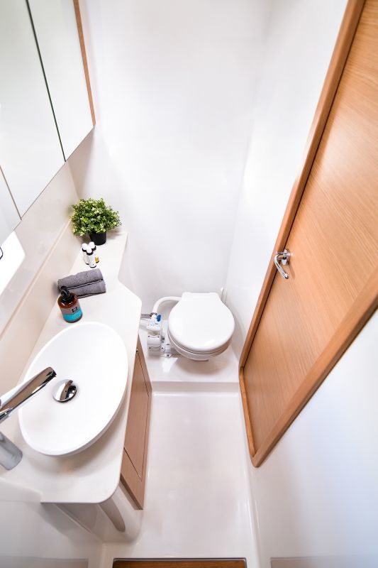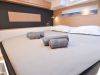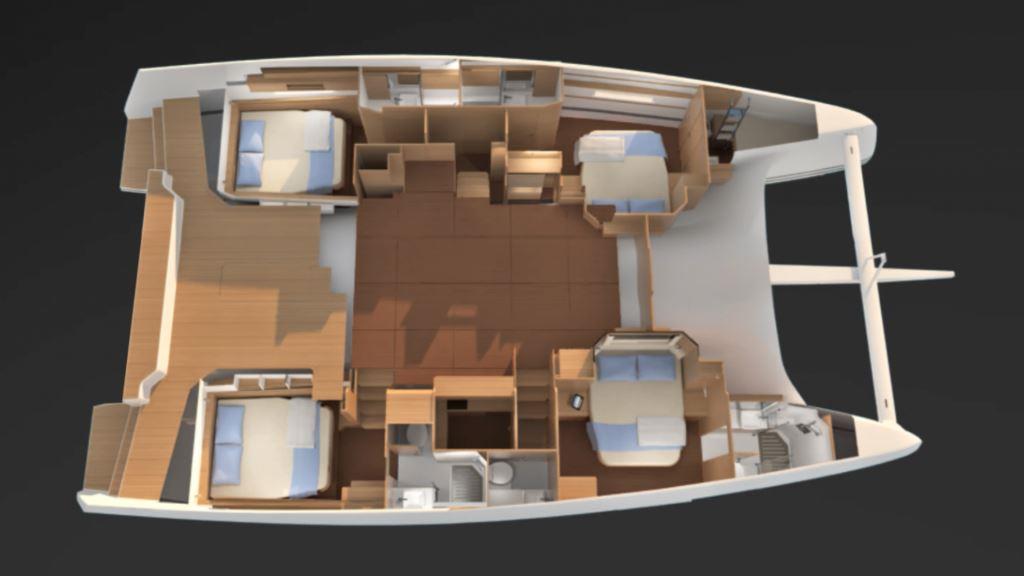 In terms of sleeping, this extraordinary catamaran sleeps up to 12 overnight guests. You can choose between three to five cabins and up to five heads in the layout options. The starboard hull has two cabins and heads as well as a day head and service room. It’s also possible to transform it into a single bunk cabin when purchasing. The cabins each have their own entrances that ensure privacy for crew and guests onboard. The port hull can either have an owner’s cabin and a possible crew cabin or two double cabins mirrored to the starboard hull depending on the layout purchased. All the cabins have windows and hatches that allow natural light and airflow at all times.