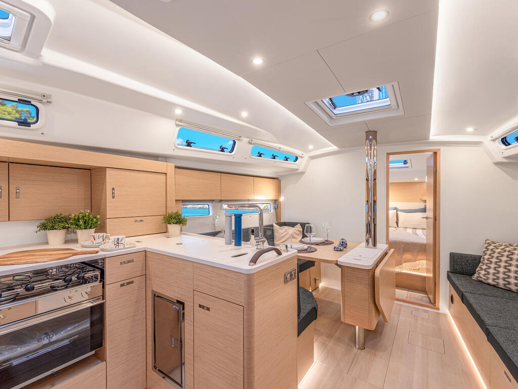 The interior balances weight-conscious performance design with genuine cruising comfort – ideal for extended coastal sailing.