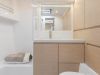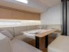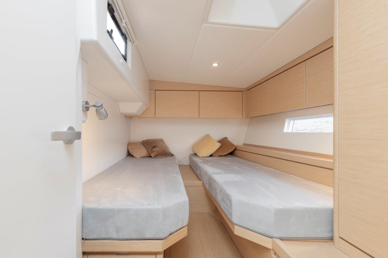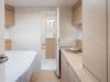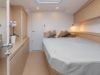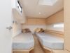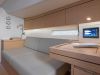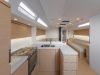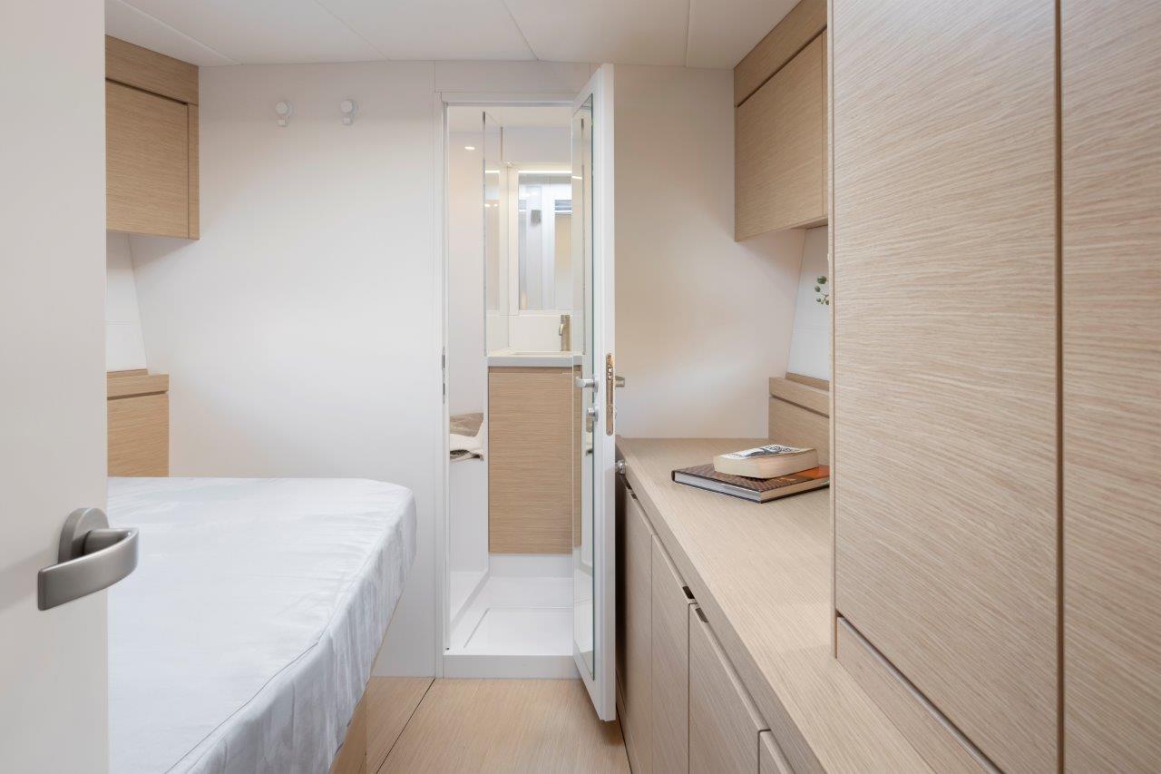 The non-conventional layout of the kitchen creates a feeling of continuity with the dinette living area. At the stern, volumes allow to realise an extra size bathroom with separated shower, at the service of the two guest cabins.