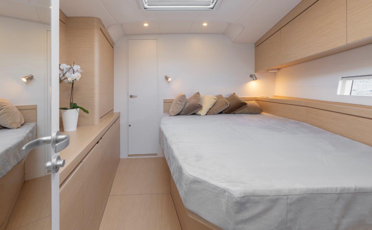 The large spaces of the owner cabin at the bow, allow for a king bed, with plenty of room.