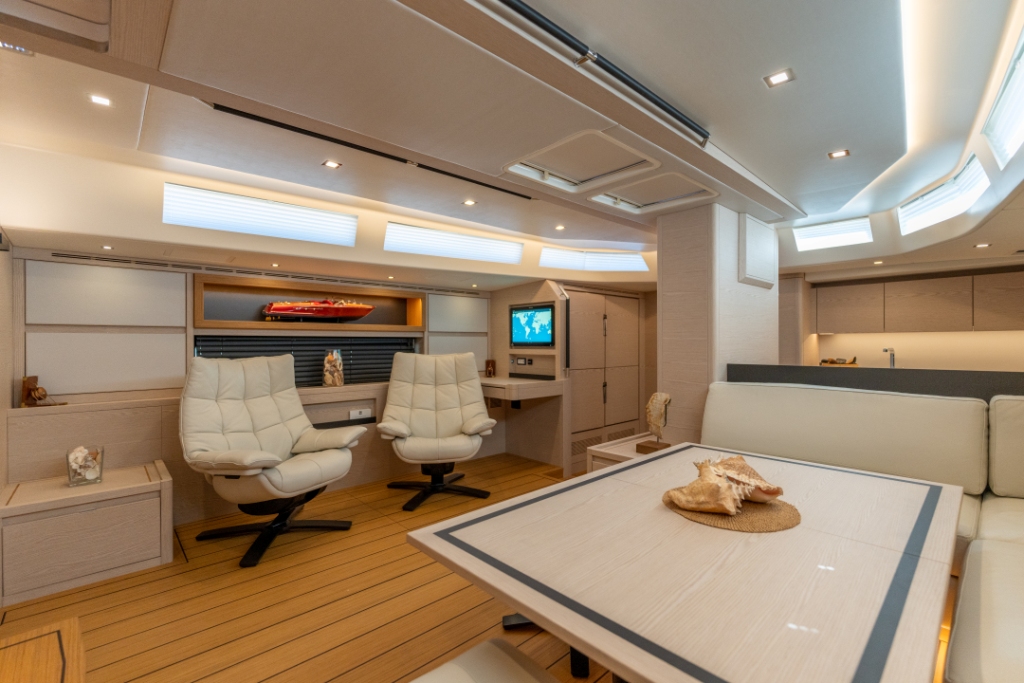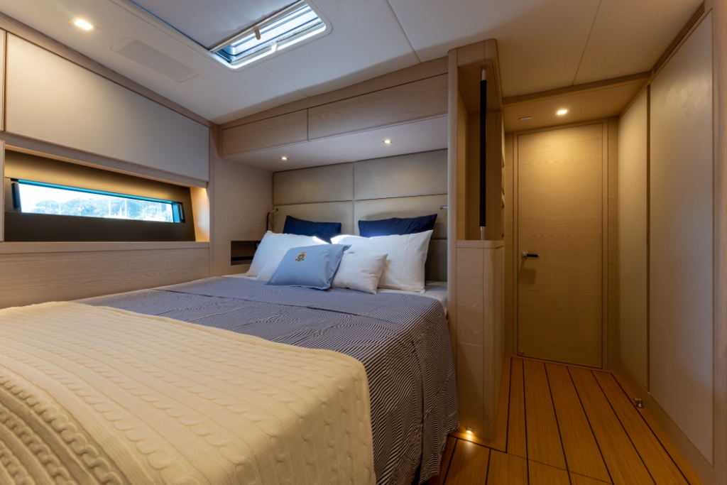 The shell and the deck are laminated in infusion from a female mold using carbon fibers; the structures always in carbon are laminated in place and also made in infusion, becoming one with hull and deck, eliminating creaks and noises. In addition to the classic gluing, the deck is bonded to the hull as well as all the bulkheads, creating a monolithic and very rigid structure. These choices, in addition to containing the weights, give the boat a solidity and strength able to withstand repeated stresses and heavy loads that are faced even in the most challenging conditions. Moreover, among the many services on board, there are structural carbon tanks for liquids under the flooring of the dinette, super soundproof engine room with double seals on the doors etc.