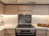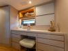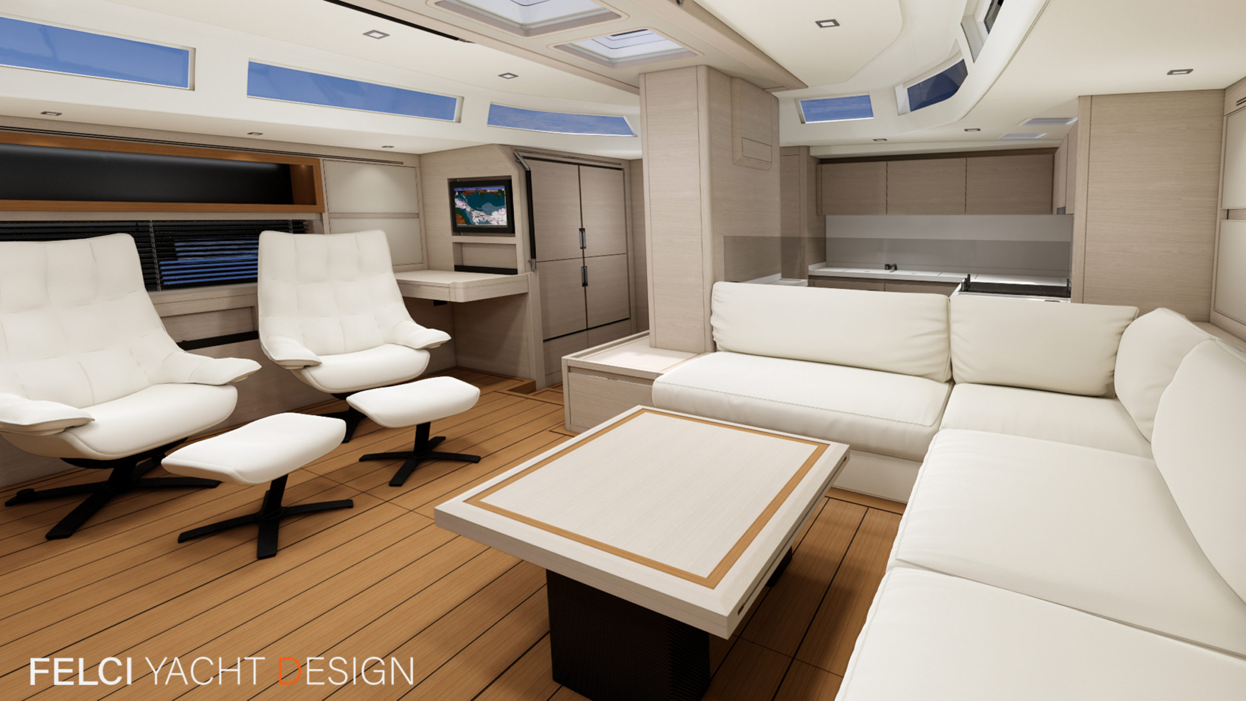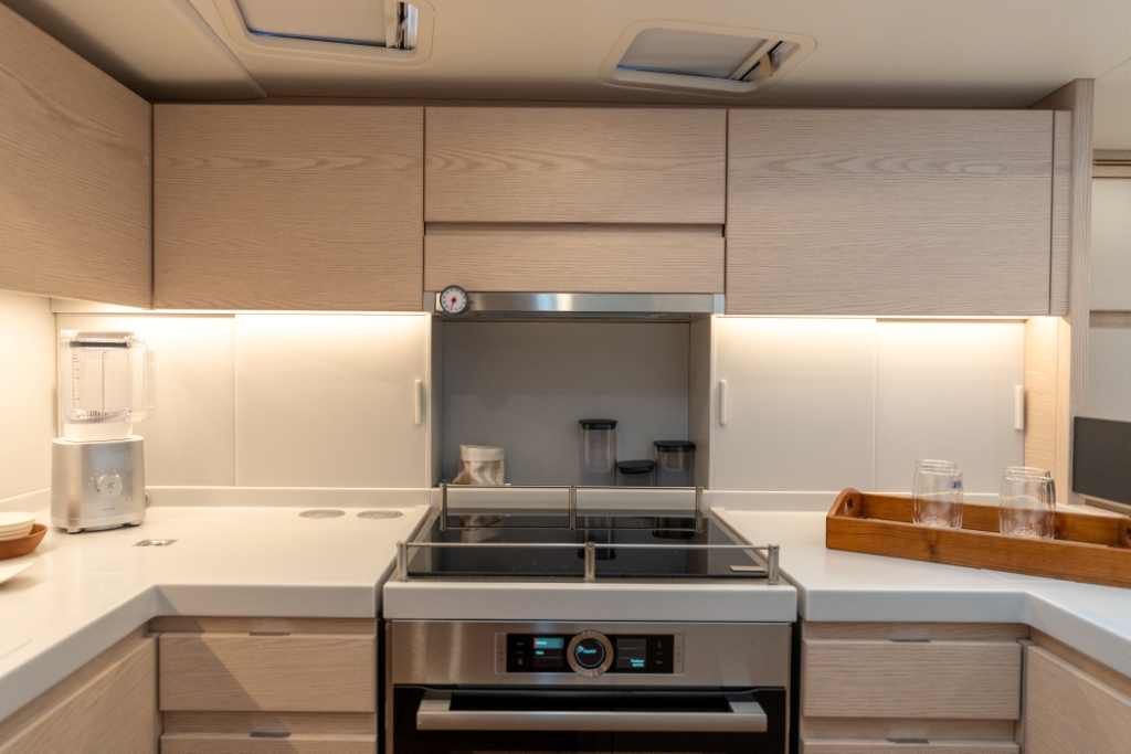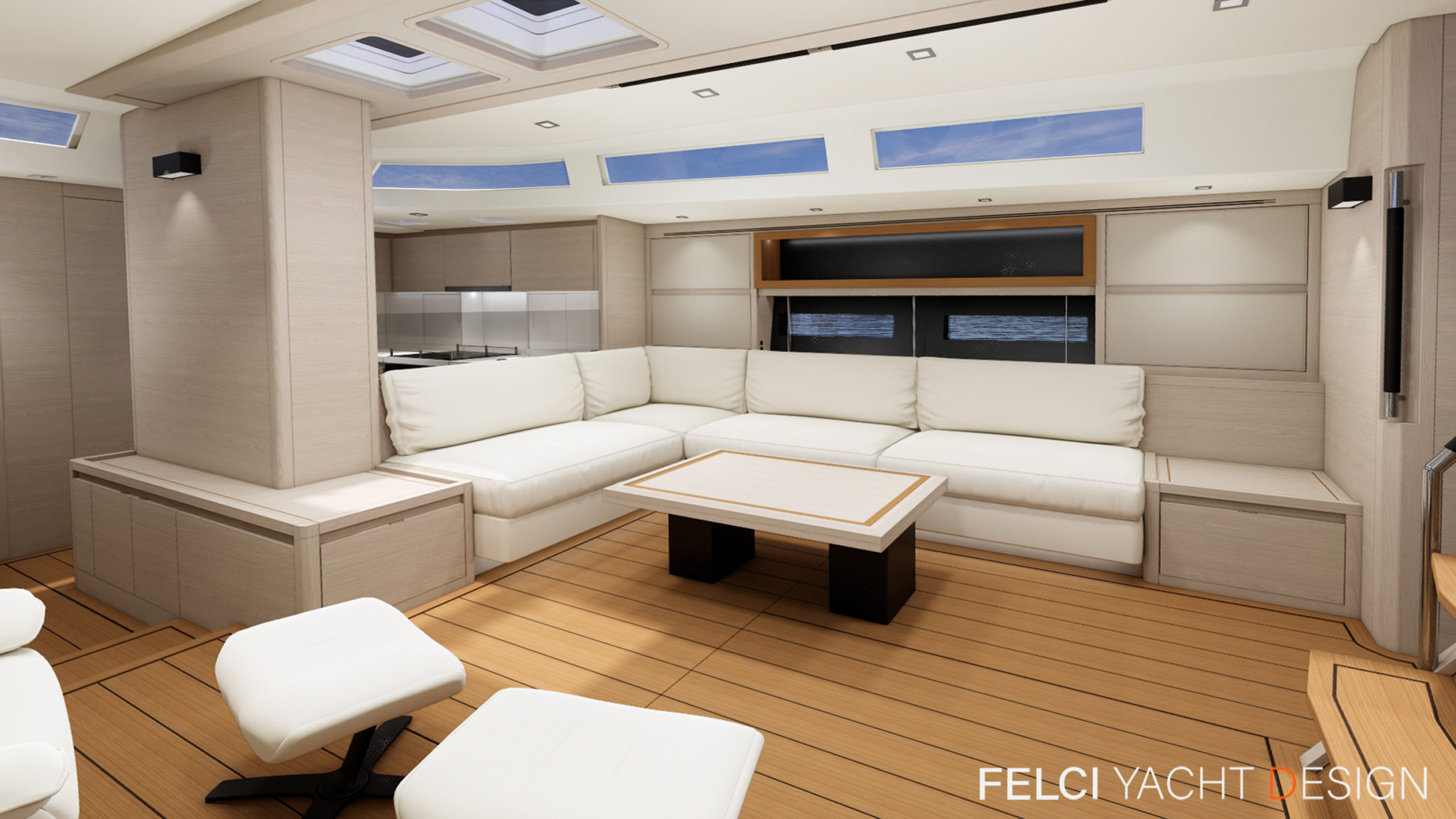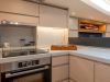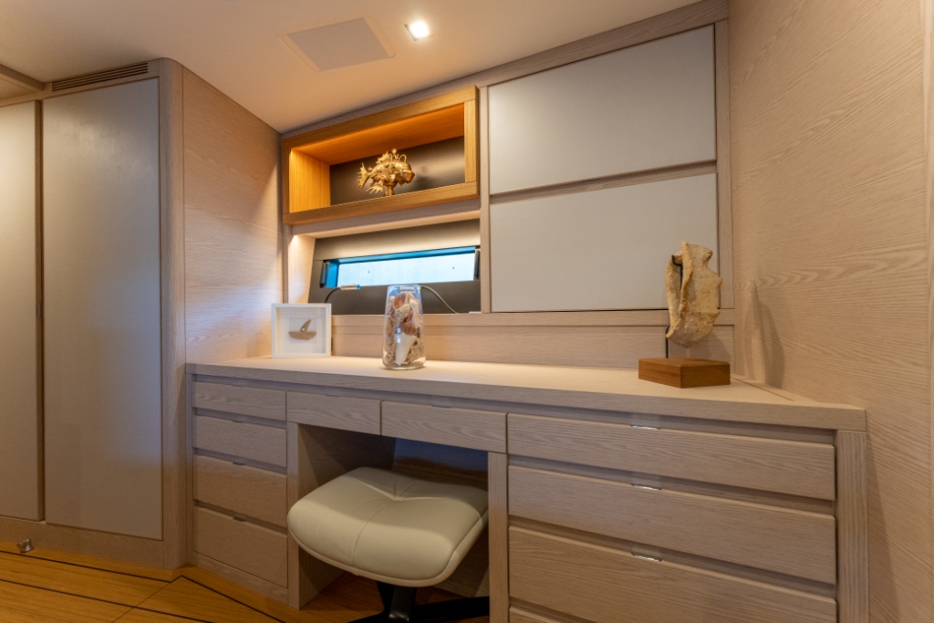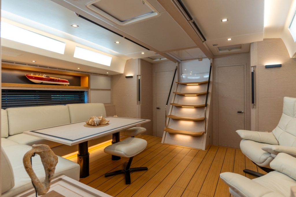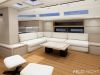 Thanks to the technologies used for the realisation of the interiors, such as the use of lightened panels, a considerable saving of weight is obtained compared to a traditional realization, without renouncing to the quality of the carpentry work, both in the refinement of finishes and in the excellence of details. The interiors are foreseen in the version with four cabins, three bathrooms, and a large open kitchen.