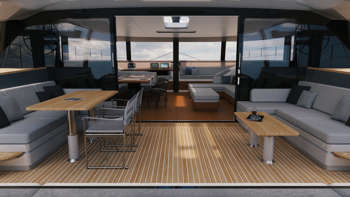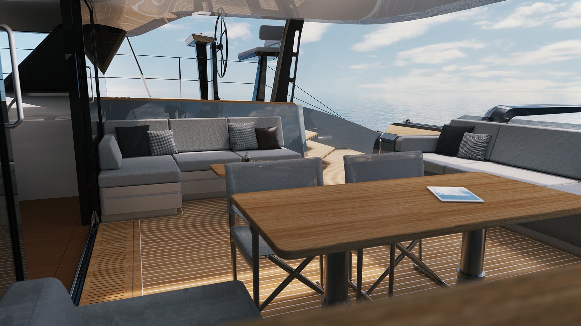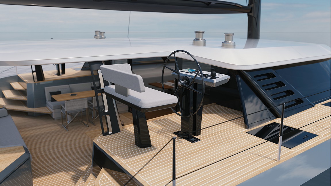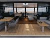 The deck is very clean and essential to allow instruments and controls to be where they are needed, leaving plenty of space for guests and crew. The cockpit is at the same level of the dinette to create a seamless connection between interiors and exteriors spaces, usable in any condition in maximum safety. One of the distinctive elements that embodies the values of practicality and liveability on board is the hardtop bimini, extremely slender and supported by two very modern arched pillars.