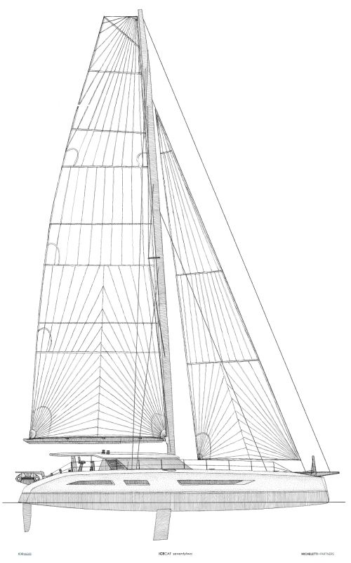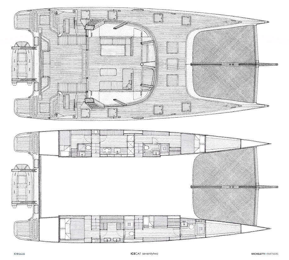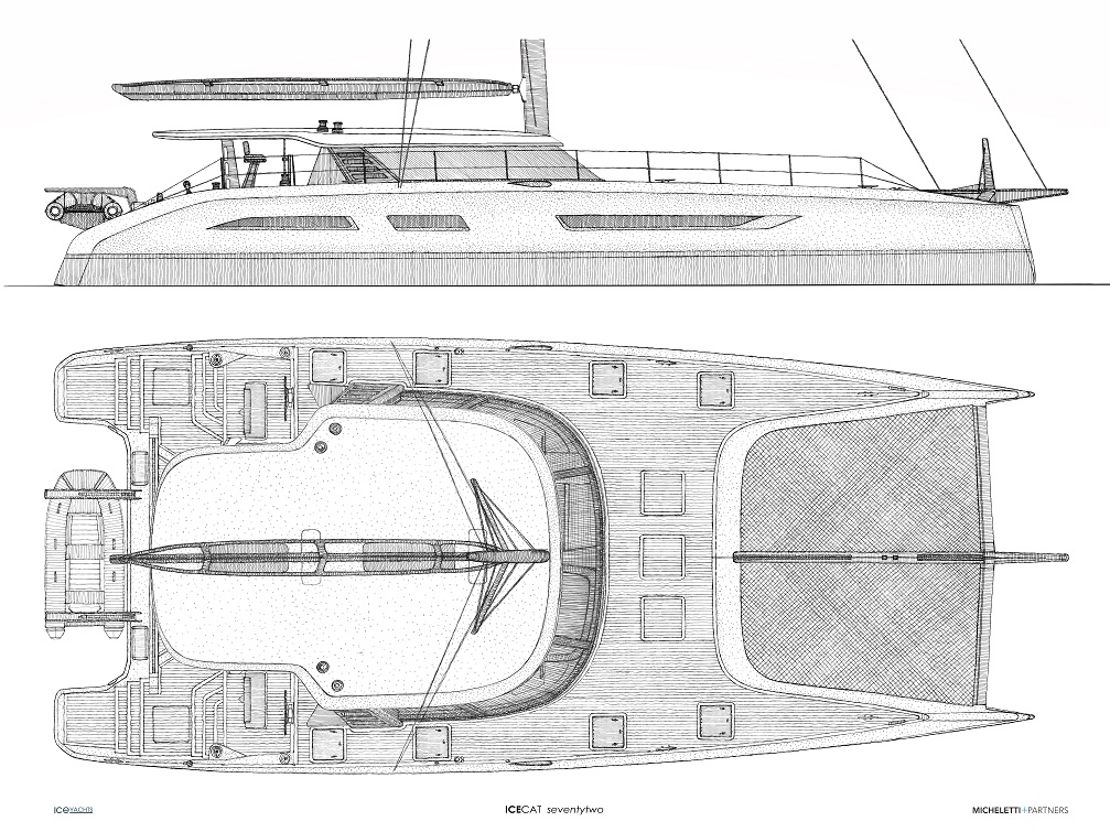 The ICECAT seventytwo represents a great step forward in the multihull design with inspirations from the automotive world. The hull has streamlined and slender lines, characterised by an almost minimal cleanliness and practical essentiality at the service of maximum performances. The goal is to obtain a catamaran capable of reaching over 30 knots of max speed. The refined sportiness and ergonomics of each space on board allow you to create excellent sailing characteristics, the comforts that a multihull of over 70 feet must have.