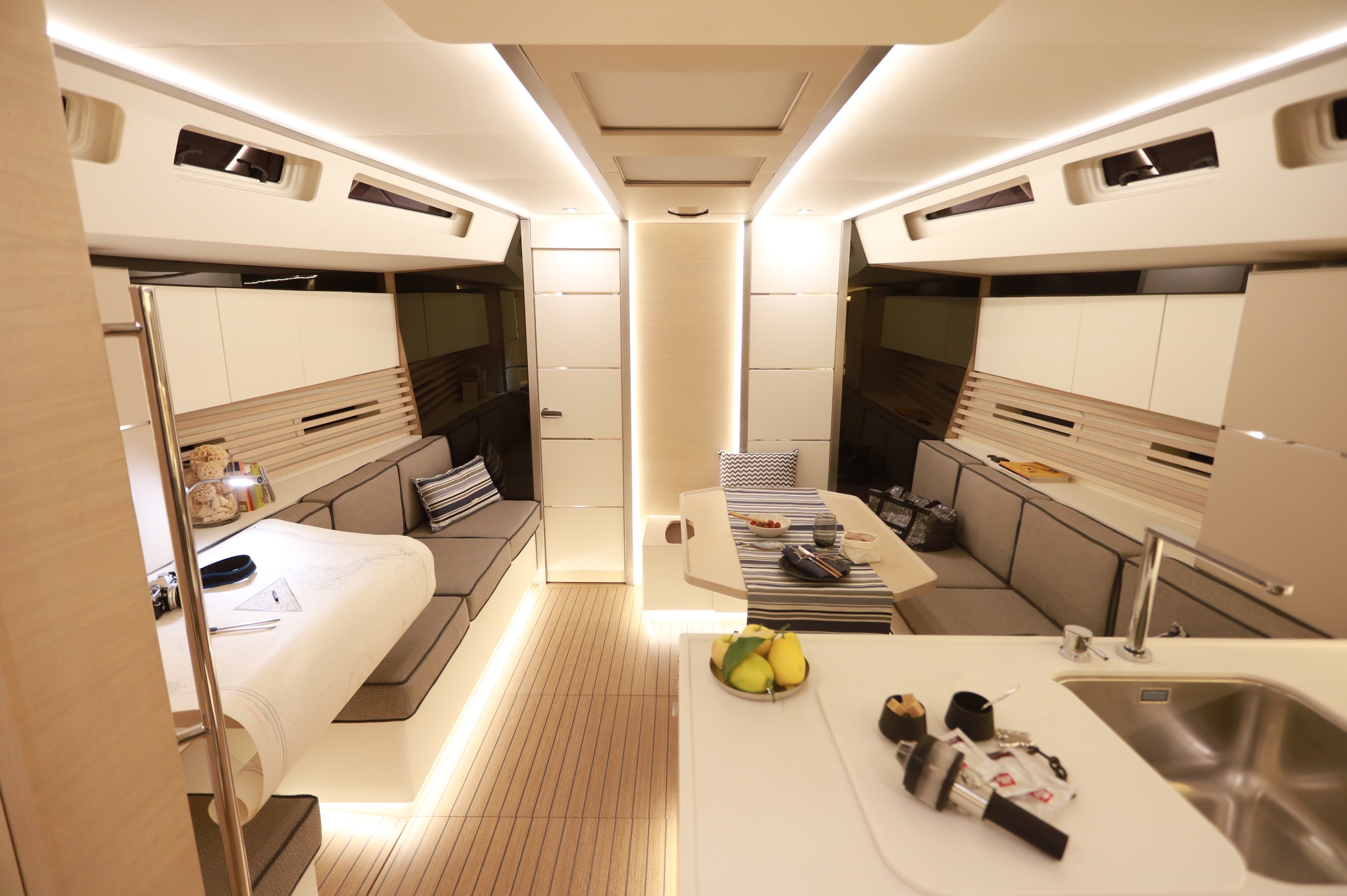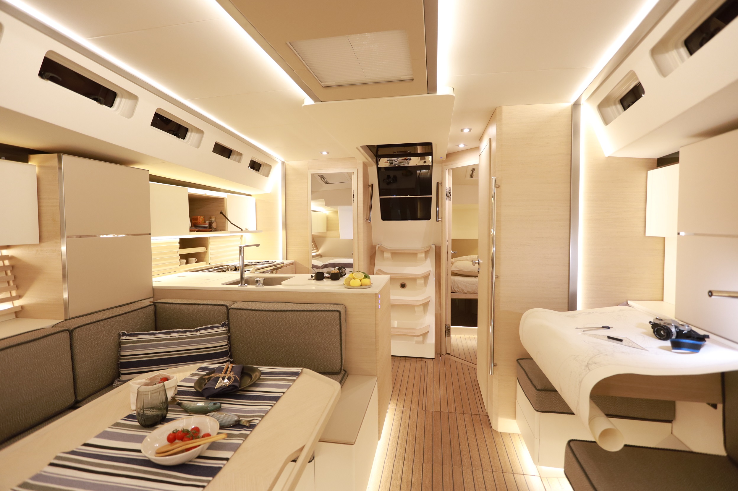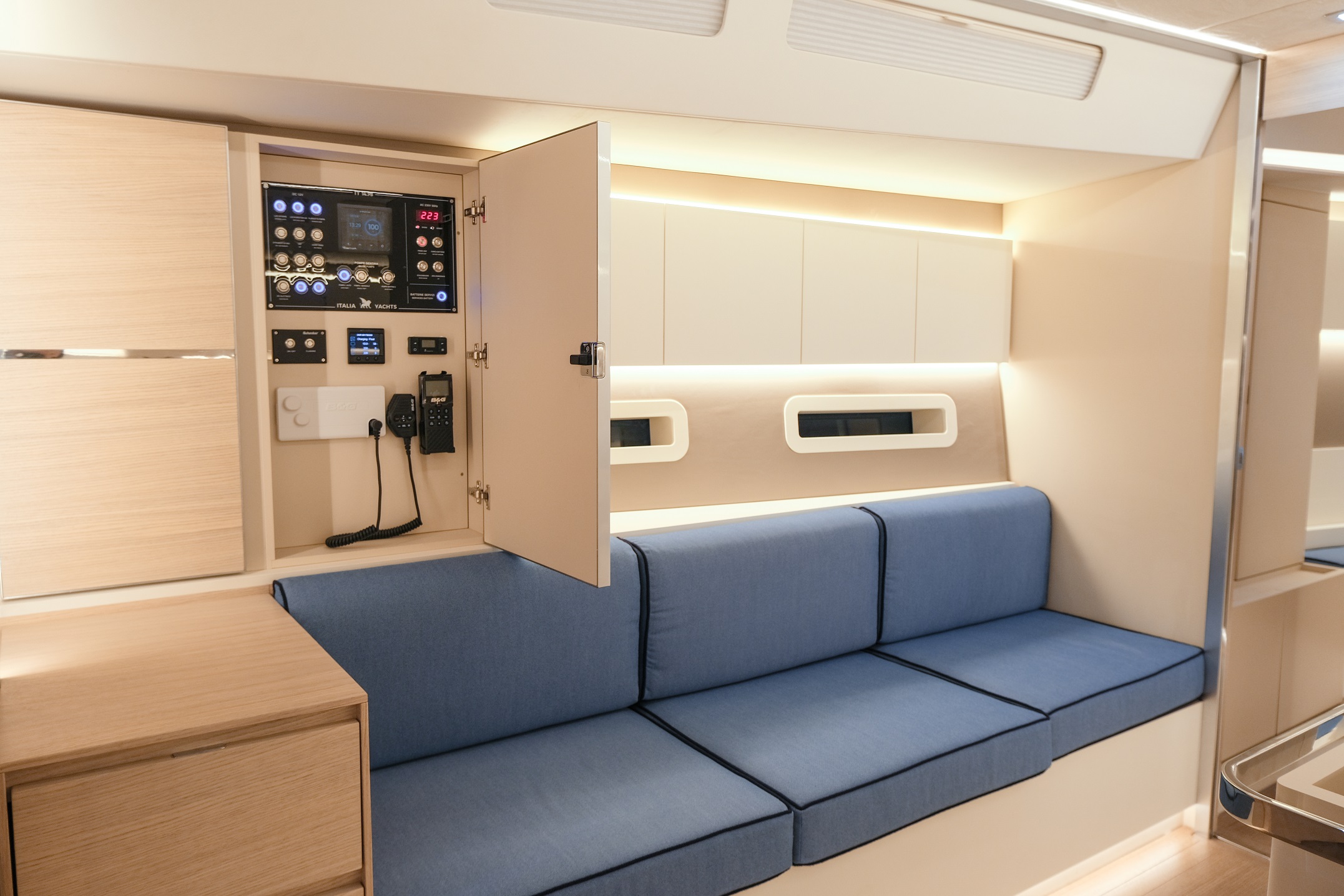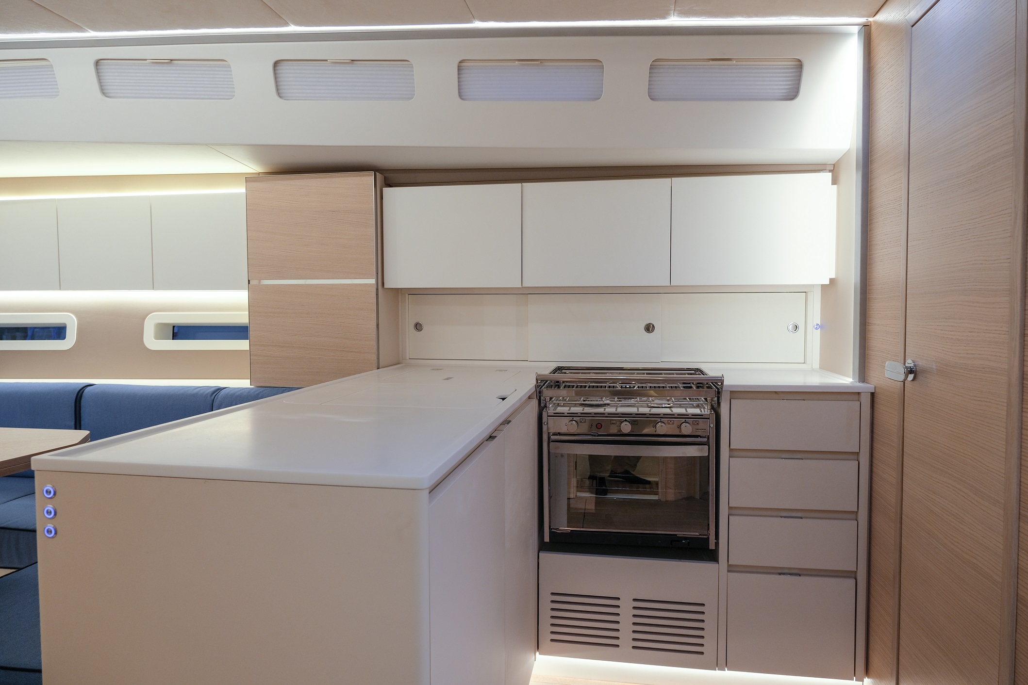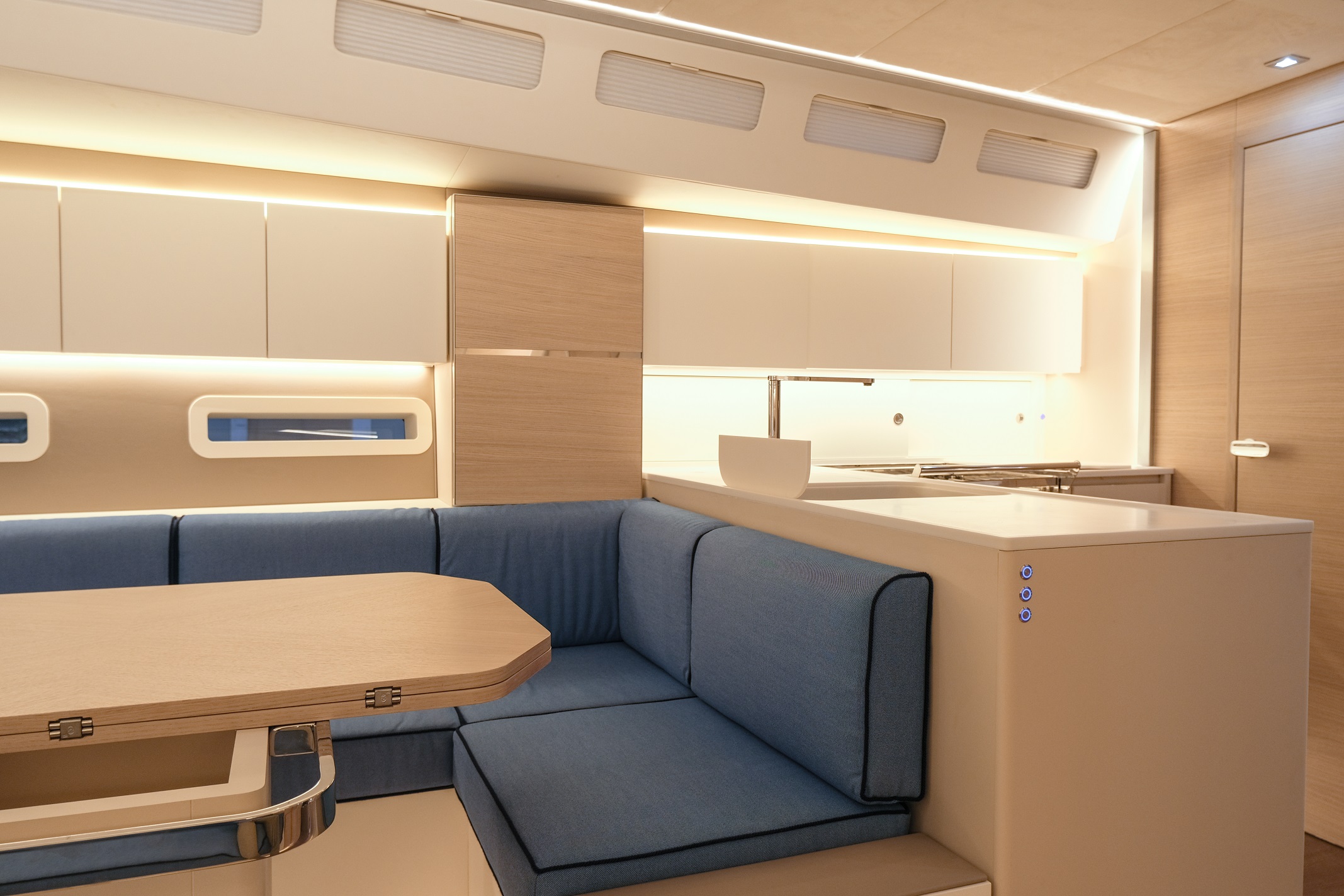 The interior design of the IY 14.98 is the result of a meticulous design process that takes into consideration both the needs of racing sailors and the desire for ample spaces and volumes typical of a comfortable yacht for long cruises. The interior layout is available in three different options, with two or three heads and spacious storage areas designed for family cruising. In the standard version, the saloon features a dining table, a U-shaped settee, and a second sofa on the opposite side. The galley, which is fully equipped, is located on the starboard side and seamlessly integrates into the living space.