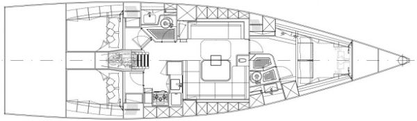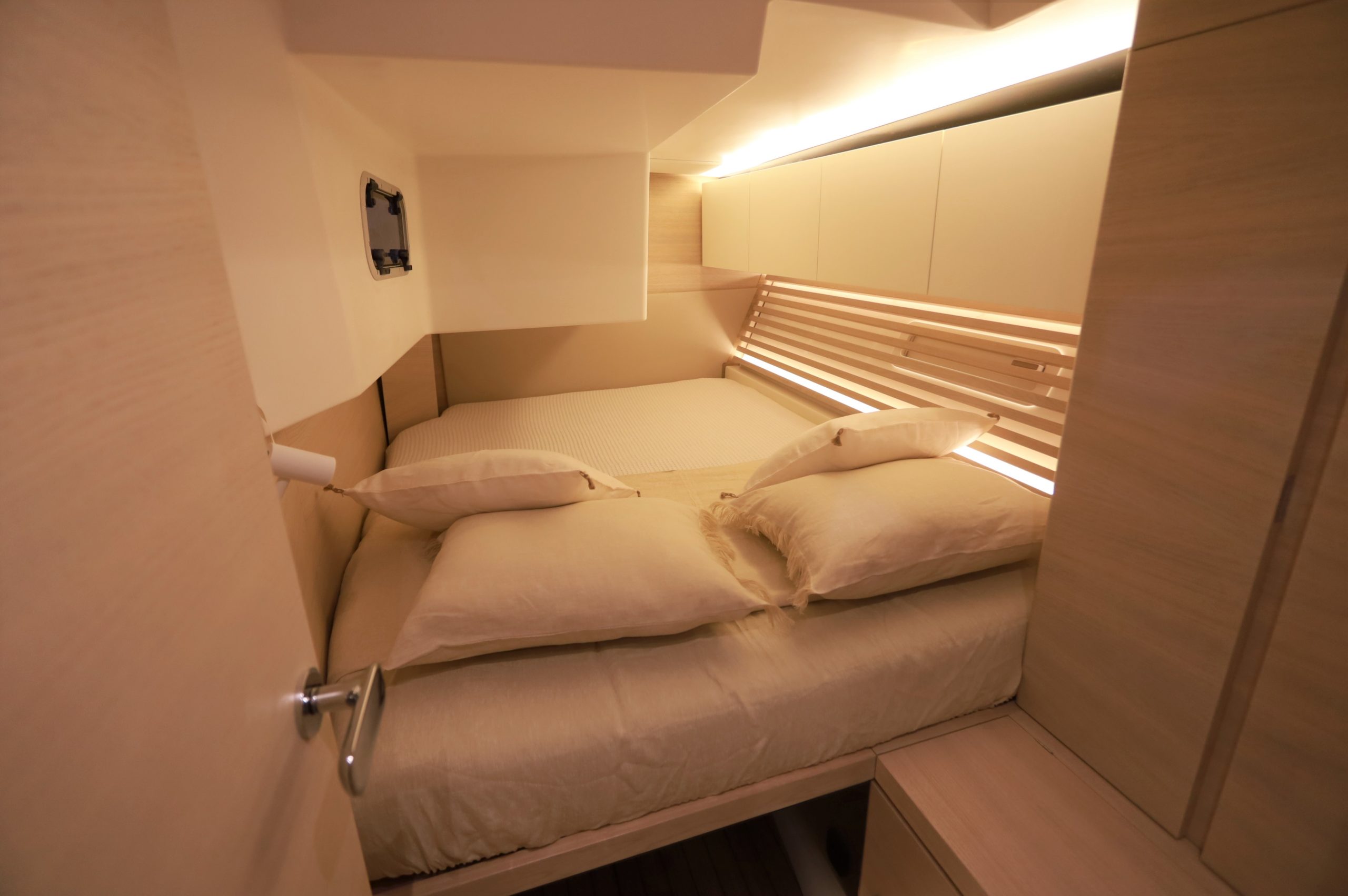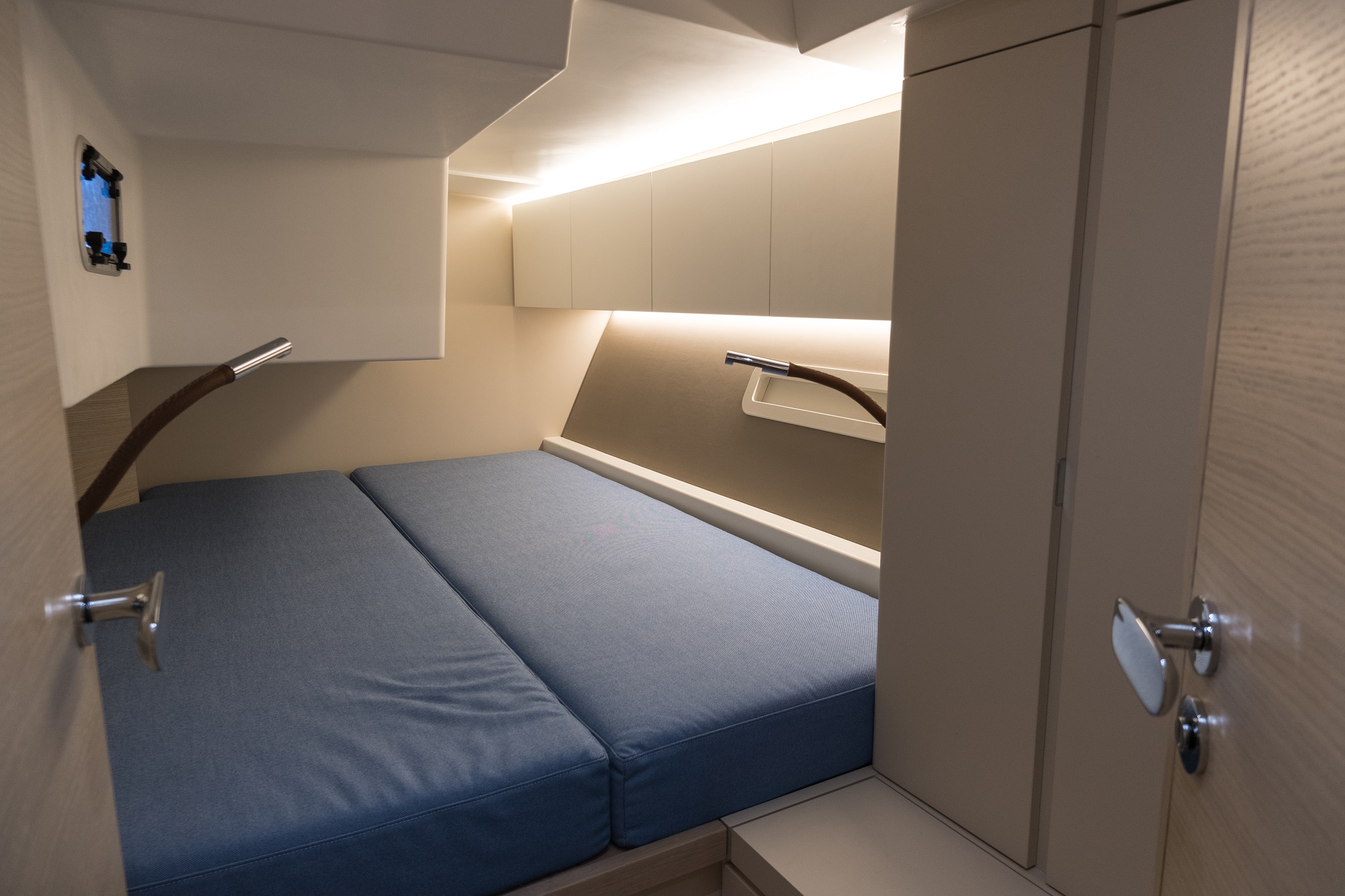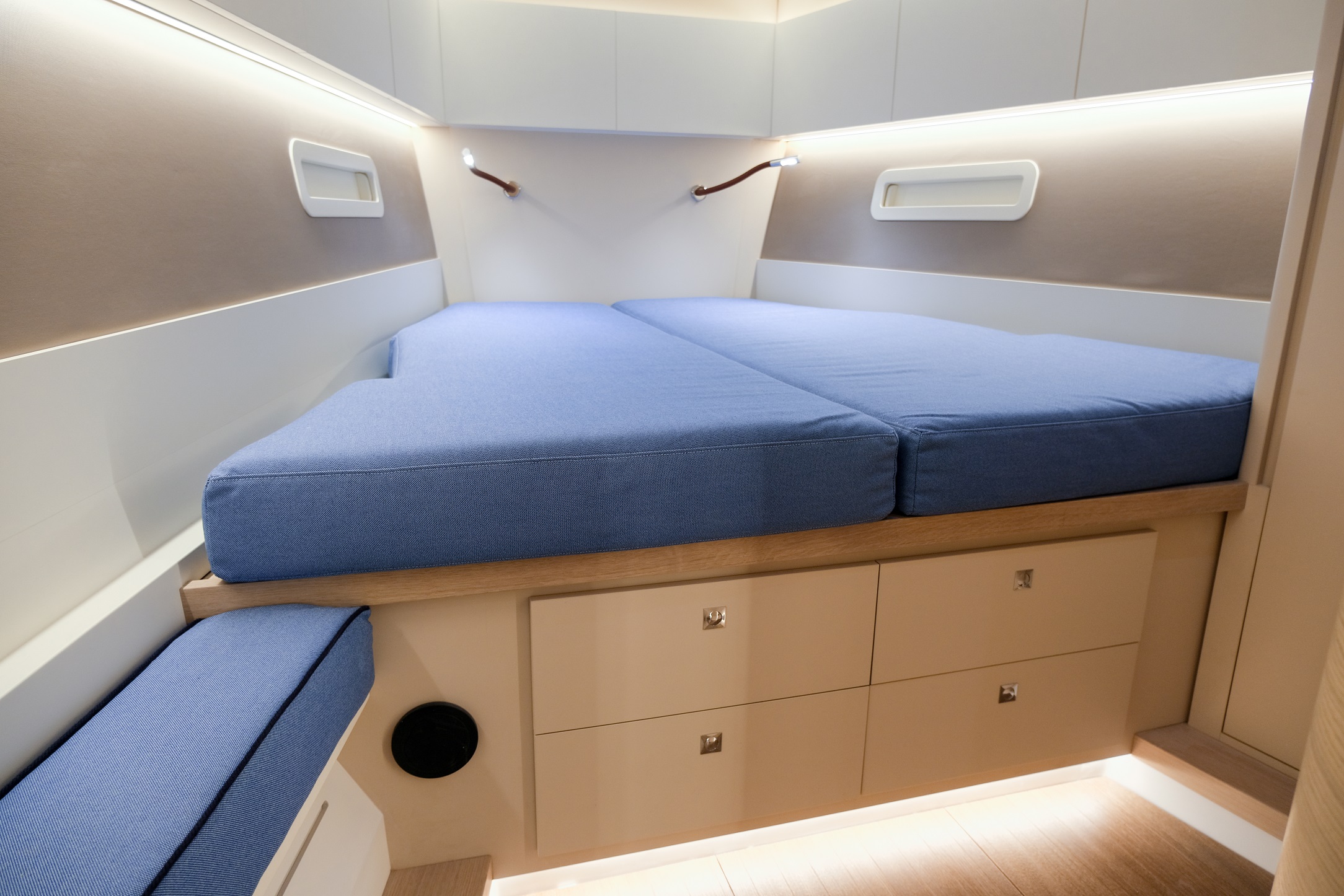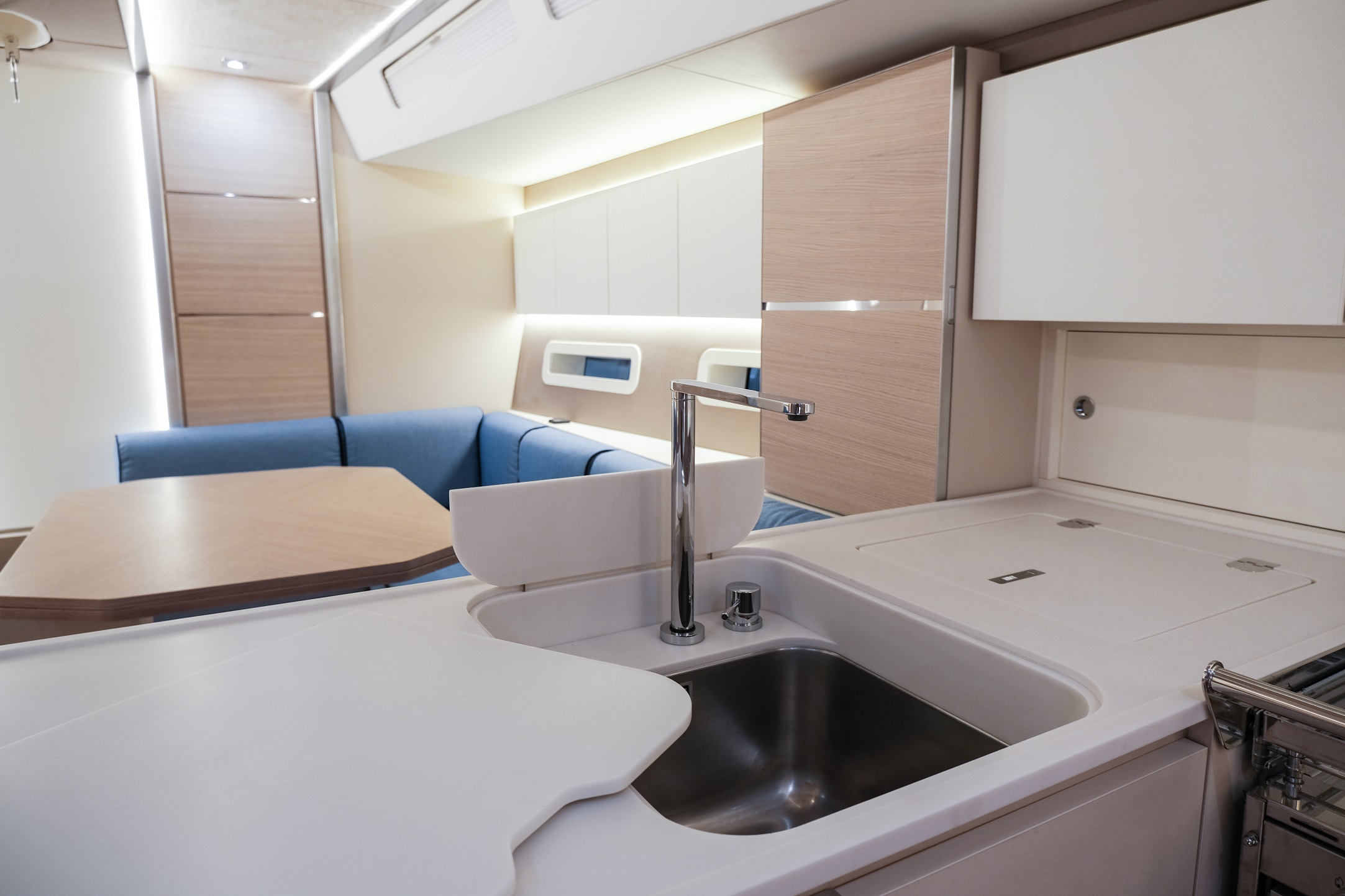 The interior design of the IY 14.98 is the result of a meticulous design process that takes into consideration both the needs of racing sailors and the desire for ample spaces and volumes typical of a comfortable yacht for long cruises. The interior layout is available in three different options, with two or three heads and spacious storage areas designed for family cruising. In the standard version, the saloon features a dining table, a U-shaped settee, and a second sofa on the opposite side. The galley, which is fully equipped, is located on the starboard side and seamlessly integrates into the living space.