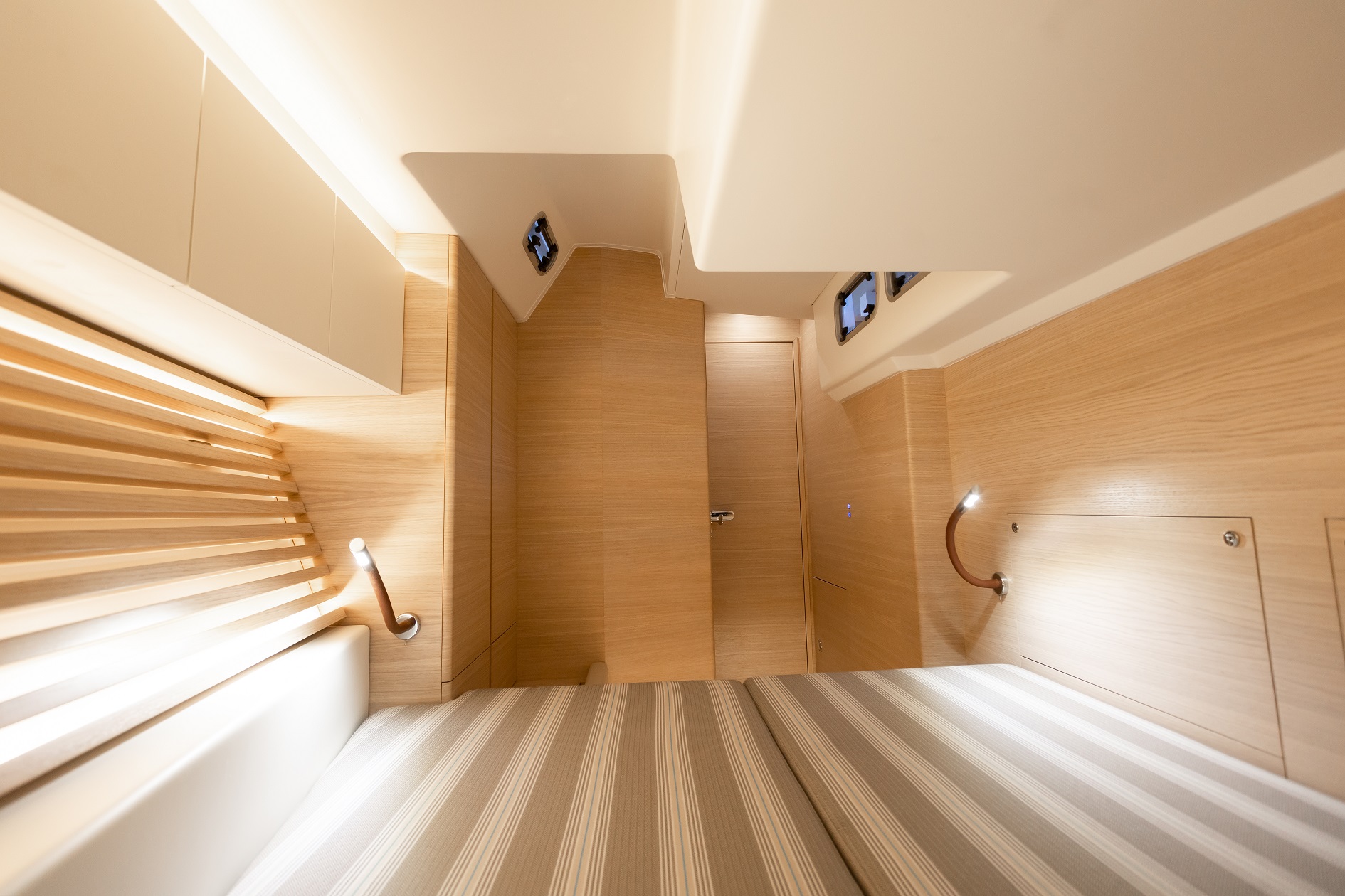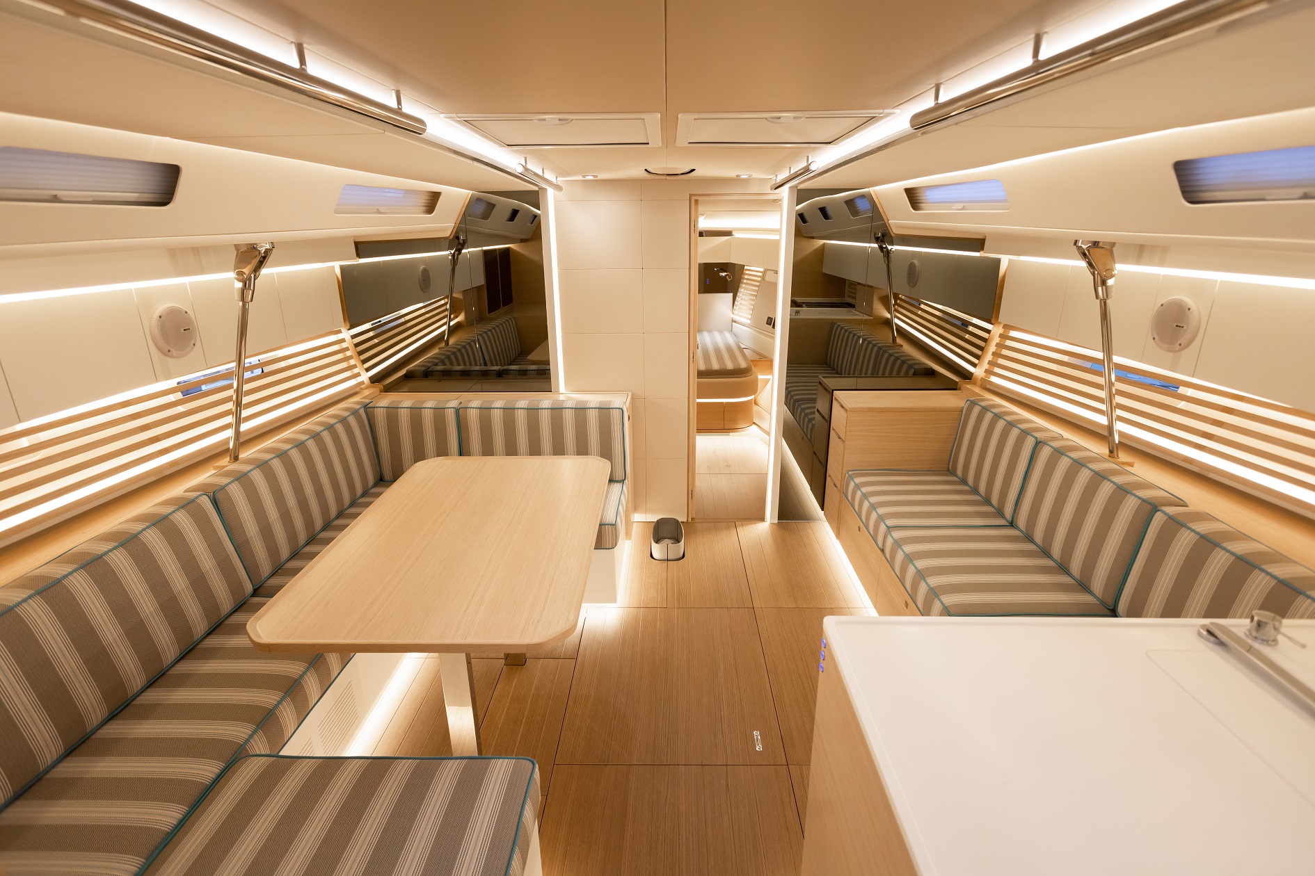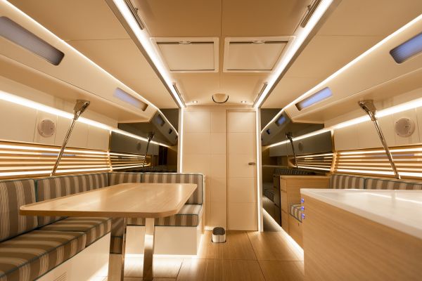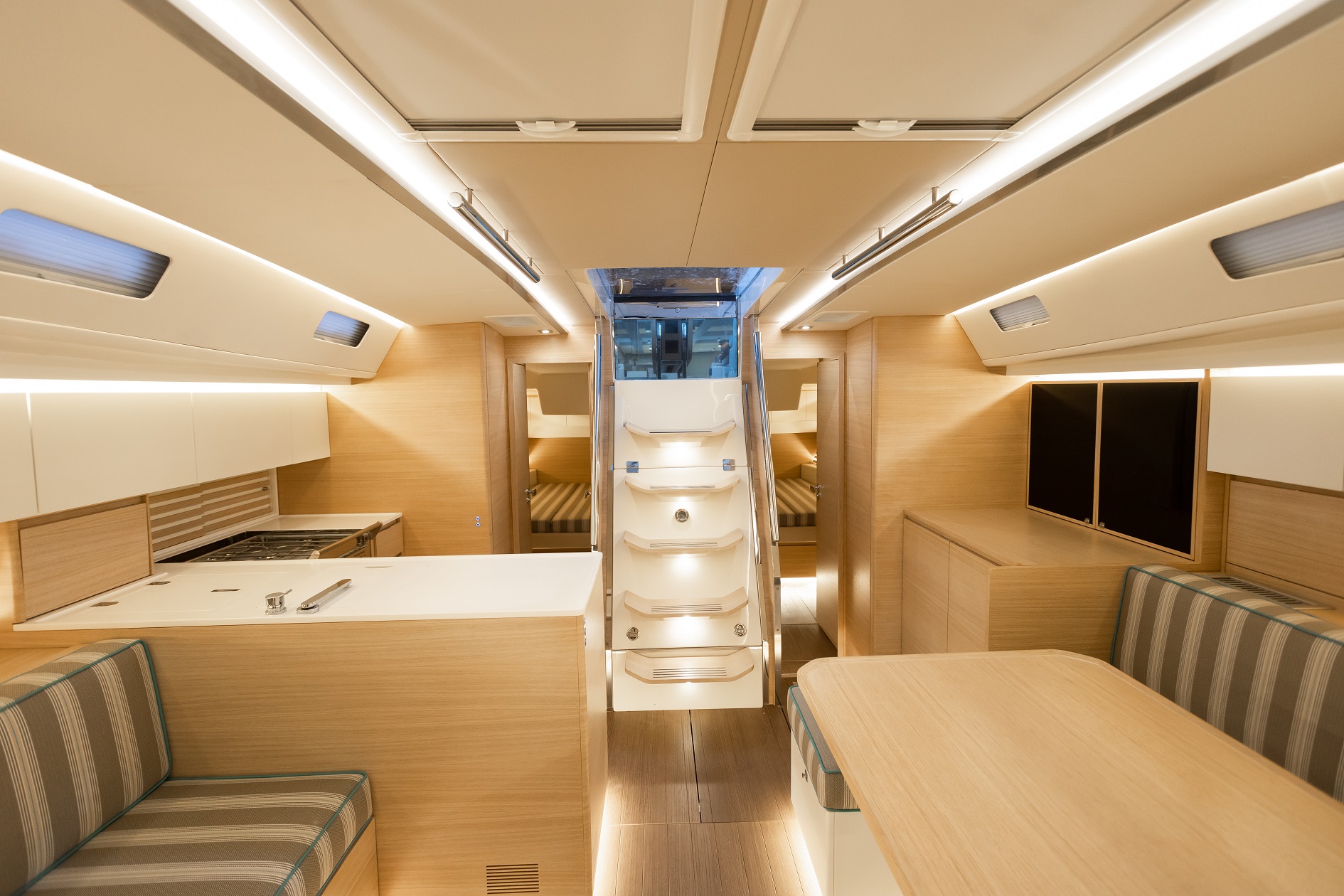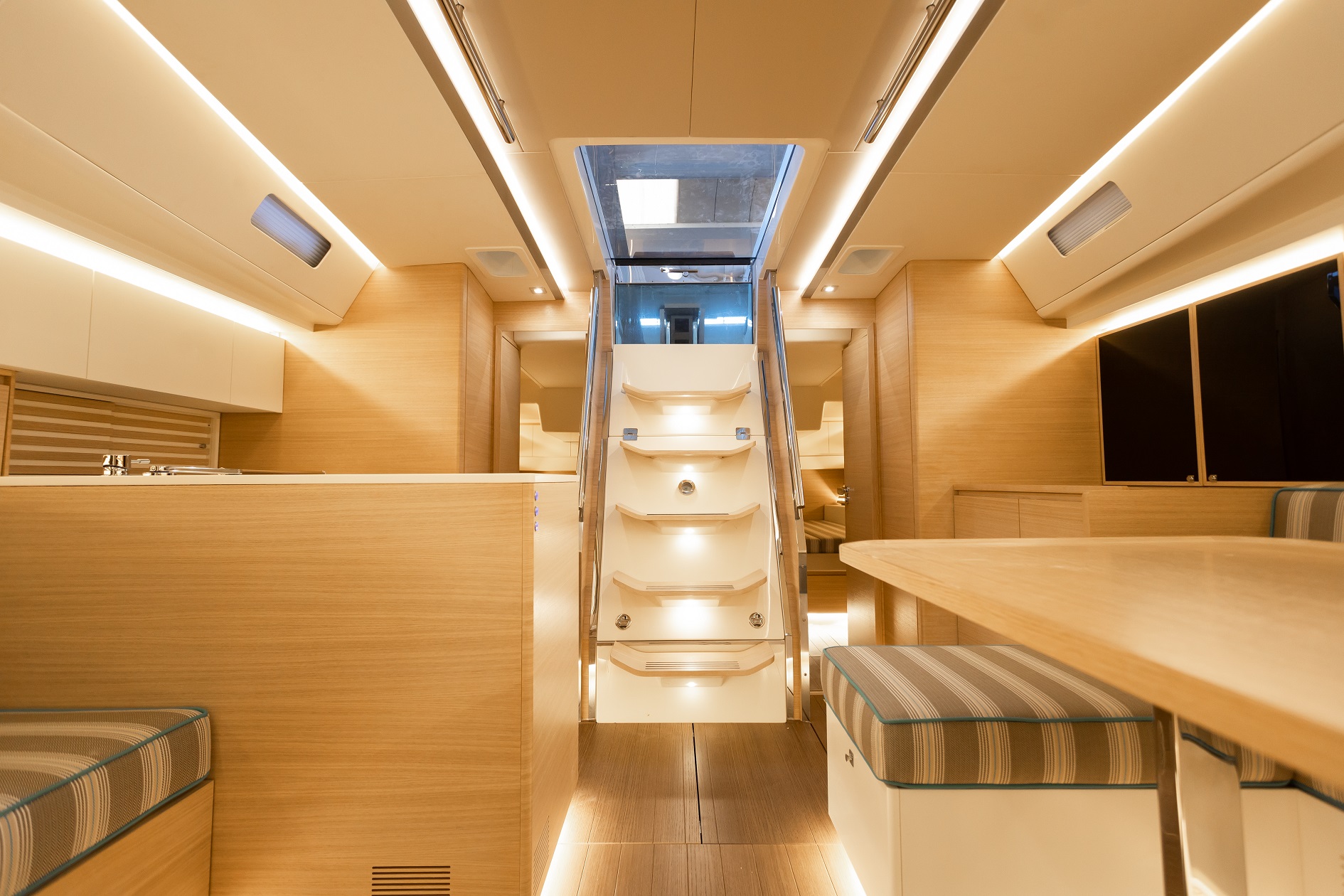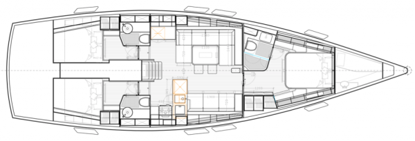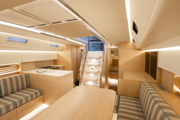 Italia Yachts offers a range of different layouts for this model. Ranging from two to four cabins, large aft cabin owners versions and separate crew cabin in the bow with sink and head. The styling of the interiors is clean and linear, with coated surfaces in natural wood alternating with white lacquered parts to ensure maximum brightness while maintaining a warm and cosy atmosphere. Polished steel is used for detailed elements throughout the interior. Handholds are numerous, and the spaces between the furniture are never too large, with a total absence of sharp edges to ensure safety even when sailing with high heeling angles. The shipyard also offers customisation of furniture, materials, finishes, and layouts to suit the preferences and needs of individual clients.