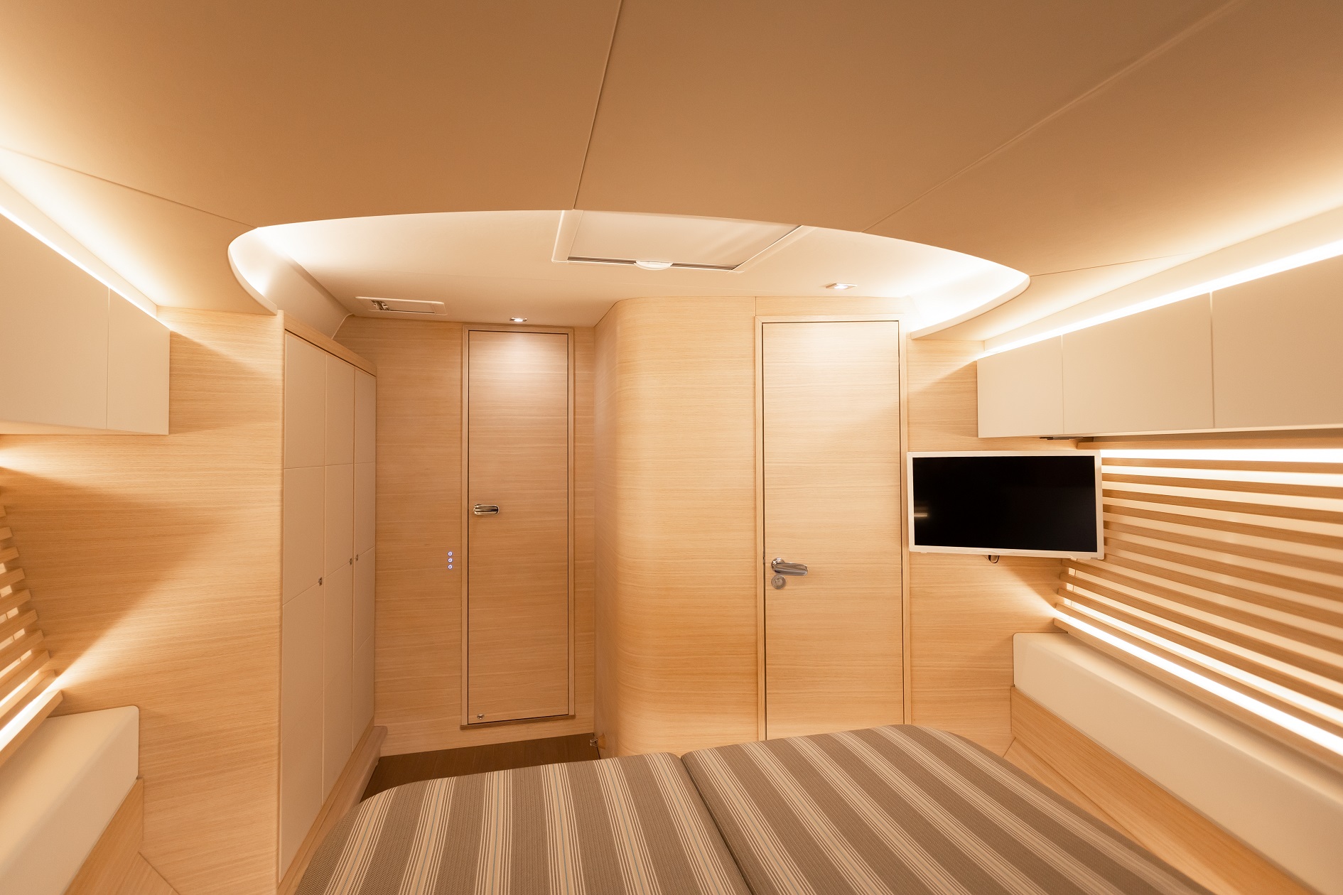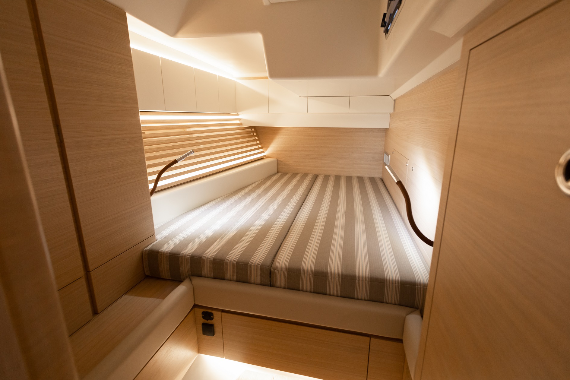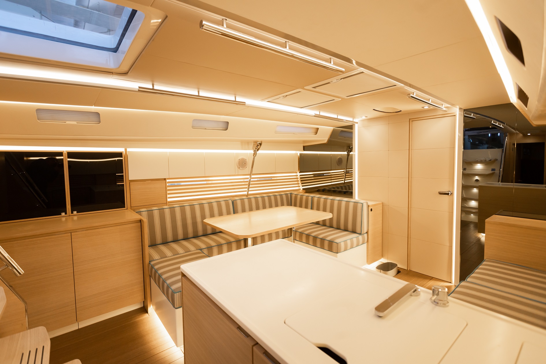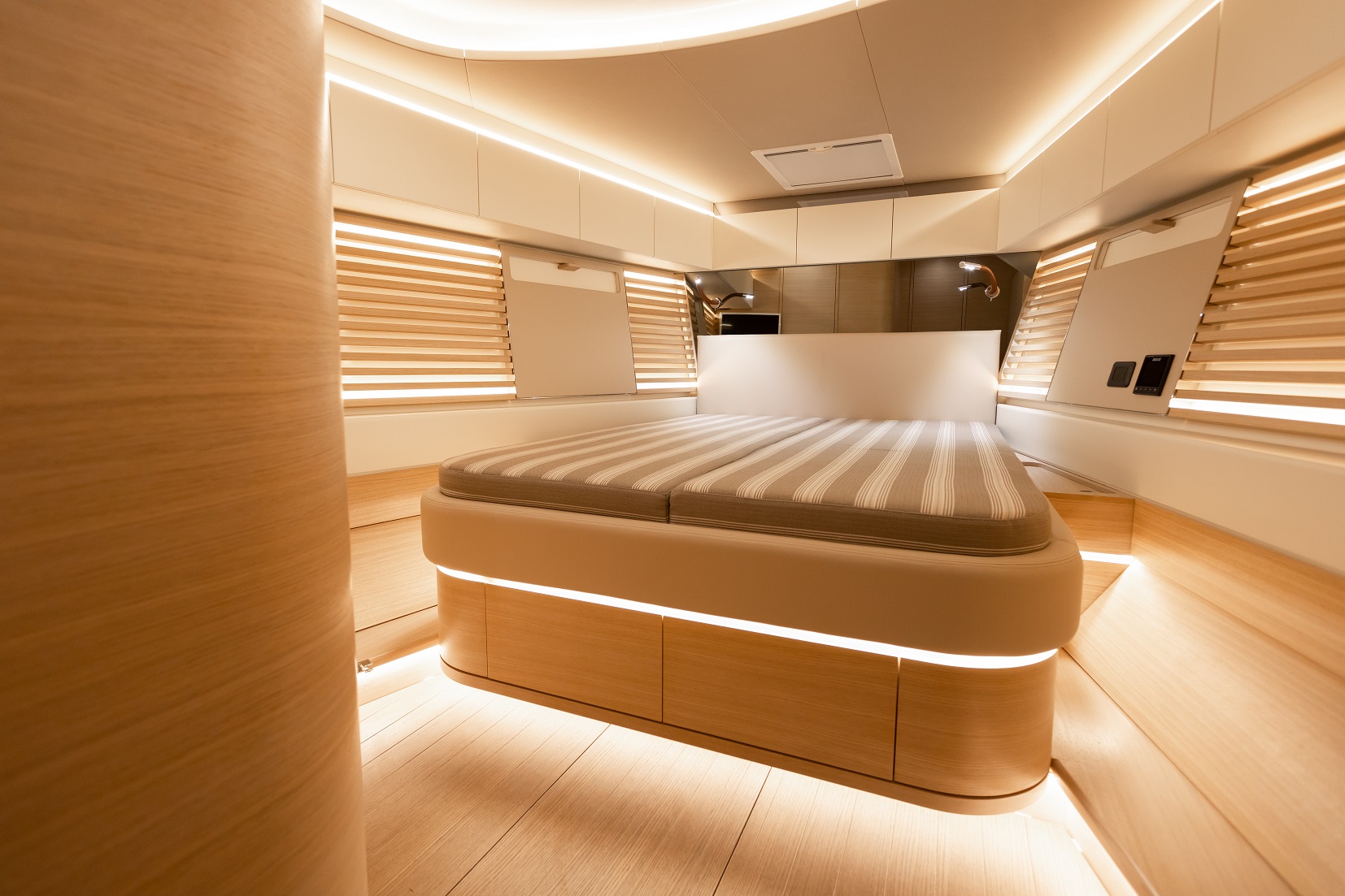 Italia Yachts offers a range of different layouts for this model. Ranging from two to four cabins, large aft cabin owners versions and separate crew cabin in the bow with sink and head. The styling of the interiors is clean and linear, with coated surfaces in natural wood alternating with white lacquered parts to ensure maximum brightness while maintaining a warm and cosy atmosphere. Polished steel is used for detailed elements throughout the interior. Handholds are numerous, and the spaces between the furniture are never too large, with a total absence of sharp edges to ensure safety even when sailing with high heeling angles. The shipyard also offers customisation of furniture, materials, finishes, and layouts to suit the preferences and needs of individual clients.