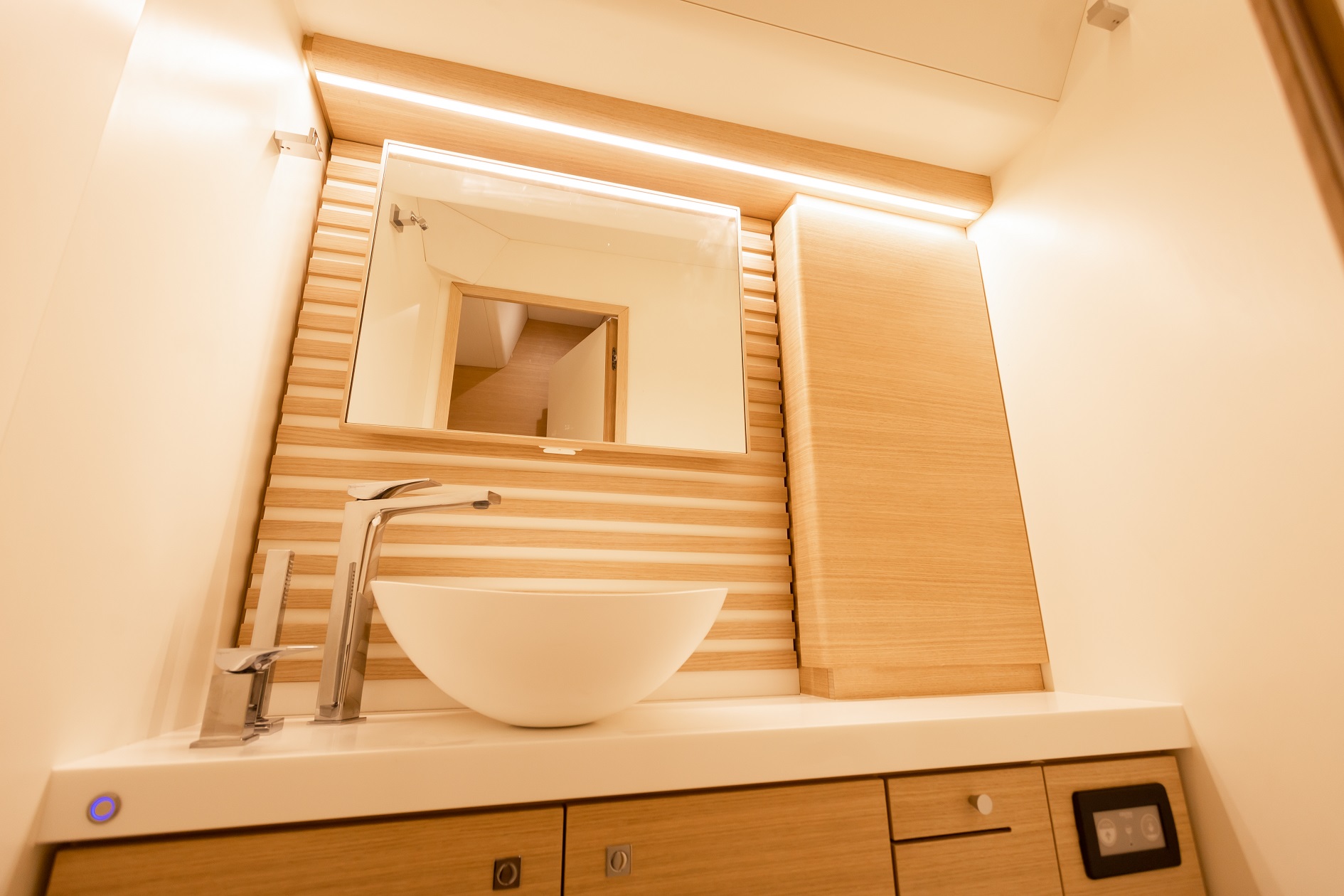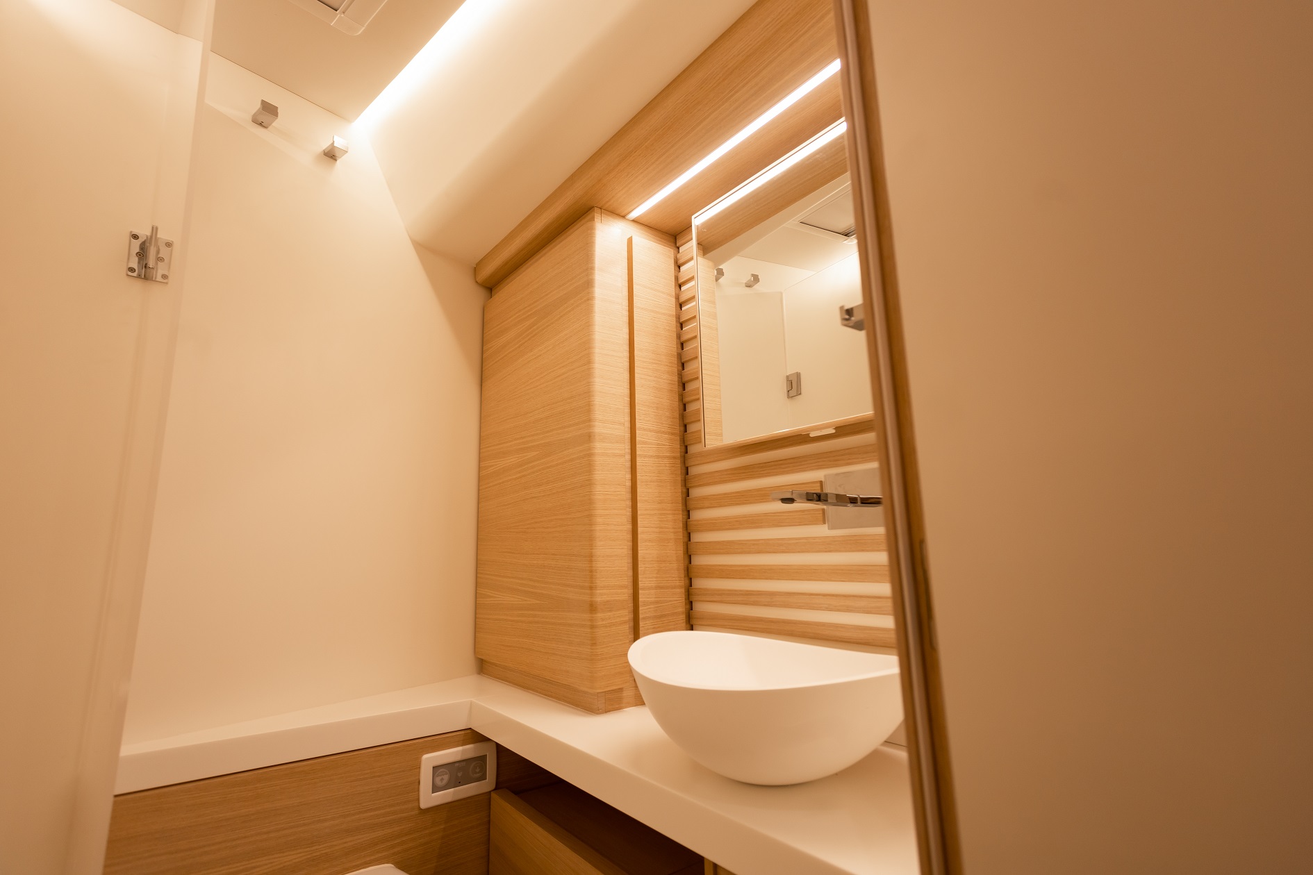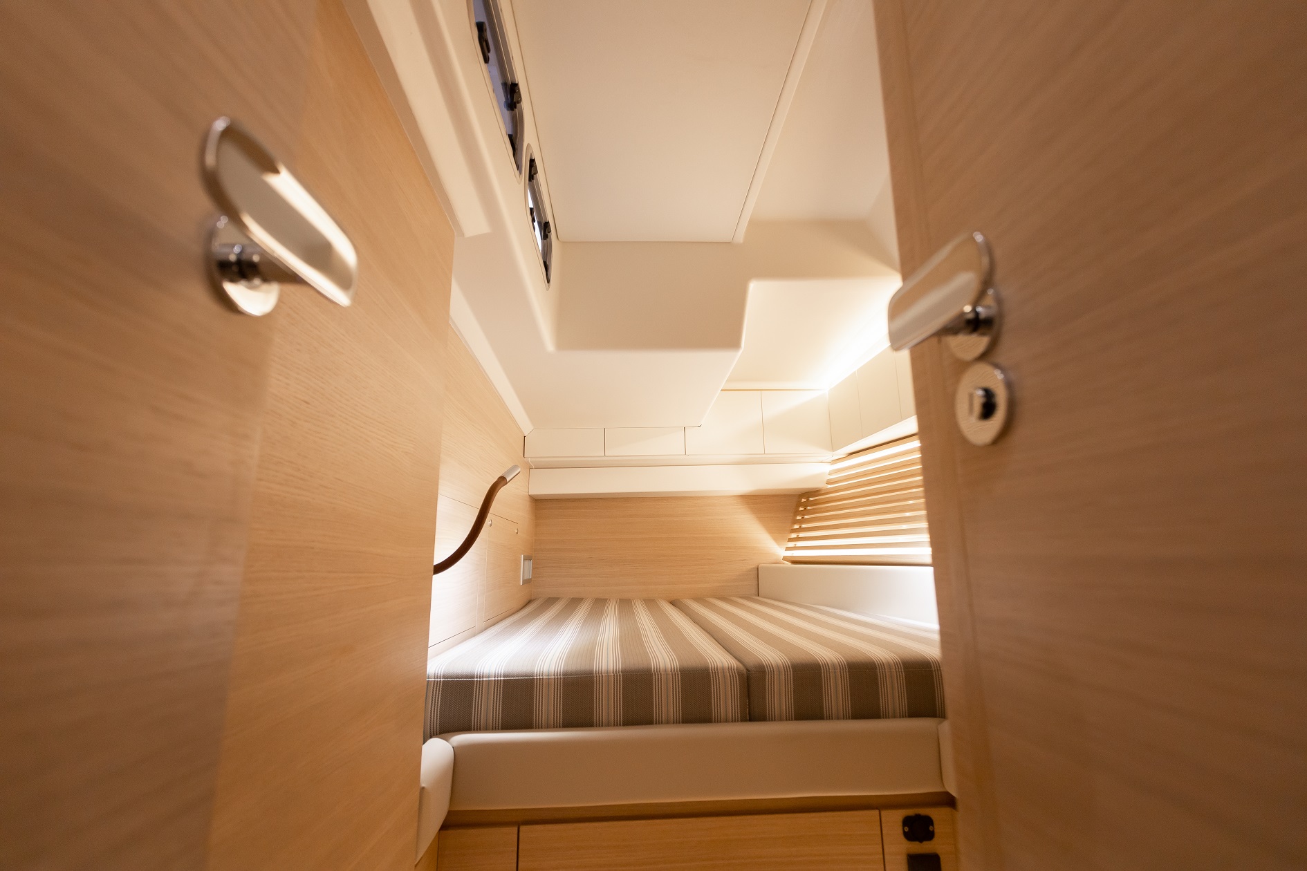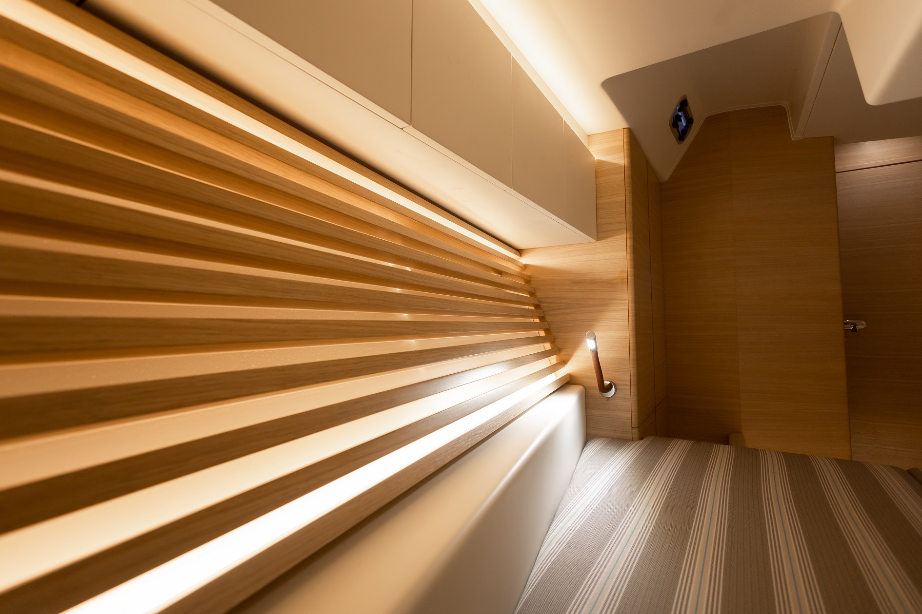 Italia Yachts offers a range of different layouts for this model. Ranging from two to four cabins, large aft cabin owners versions and separate crew cabin in the bow with sink and head. The styling of the interiors is clean and linear, with coated surfaces in natural wood alternating with white lacquered parts to ensure maximum brightness while maintaining a warm and cosy atmosphere. Polished steel is used for detailed elements throughout the interior. Handholds are numerous, and the spaces between the furniture are never too large, with a total absence of sharp edges to ensure safety even when sailing with high heeling angles. The shipyard also offers customisation of furniture, materials, finishes, and layouts to suit the preferences and needs of individual clients.