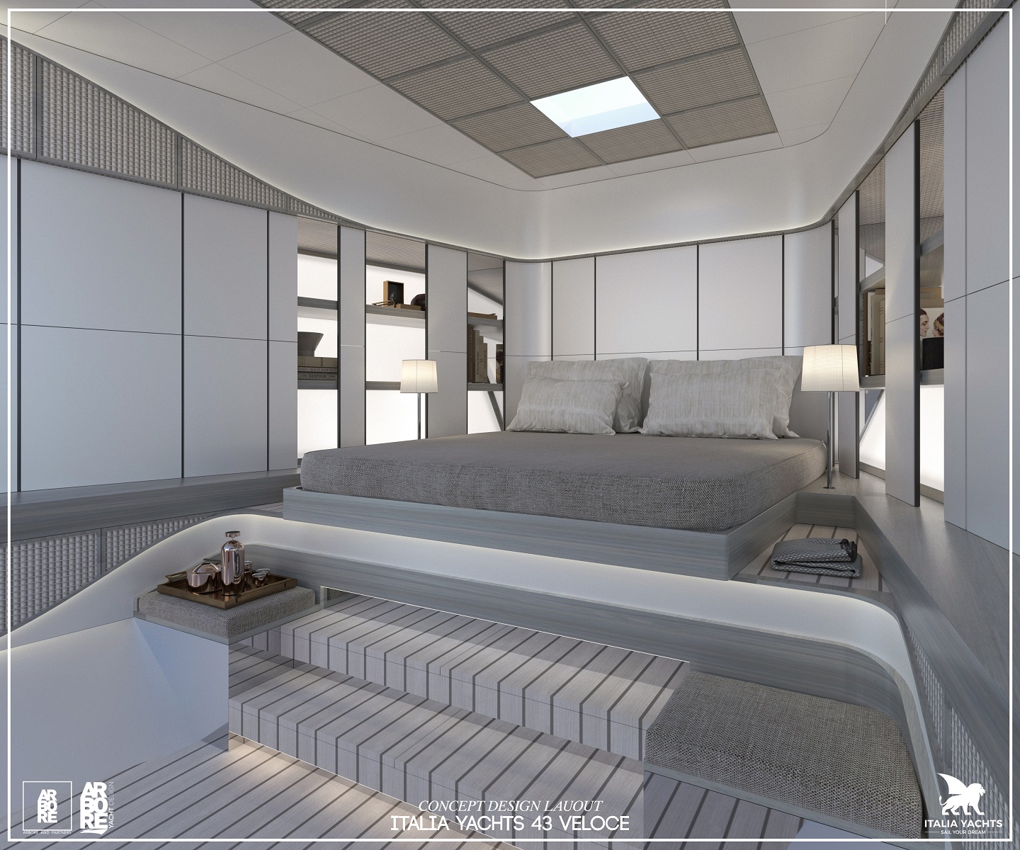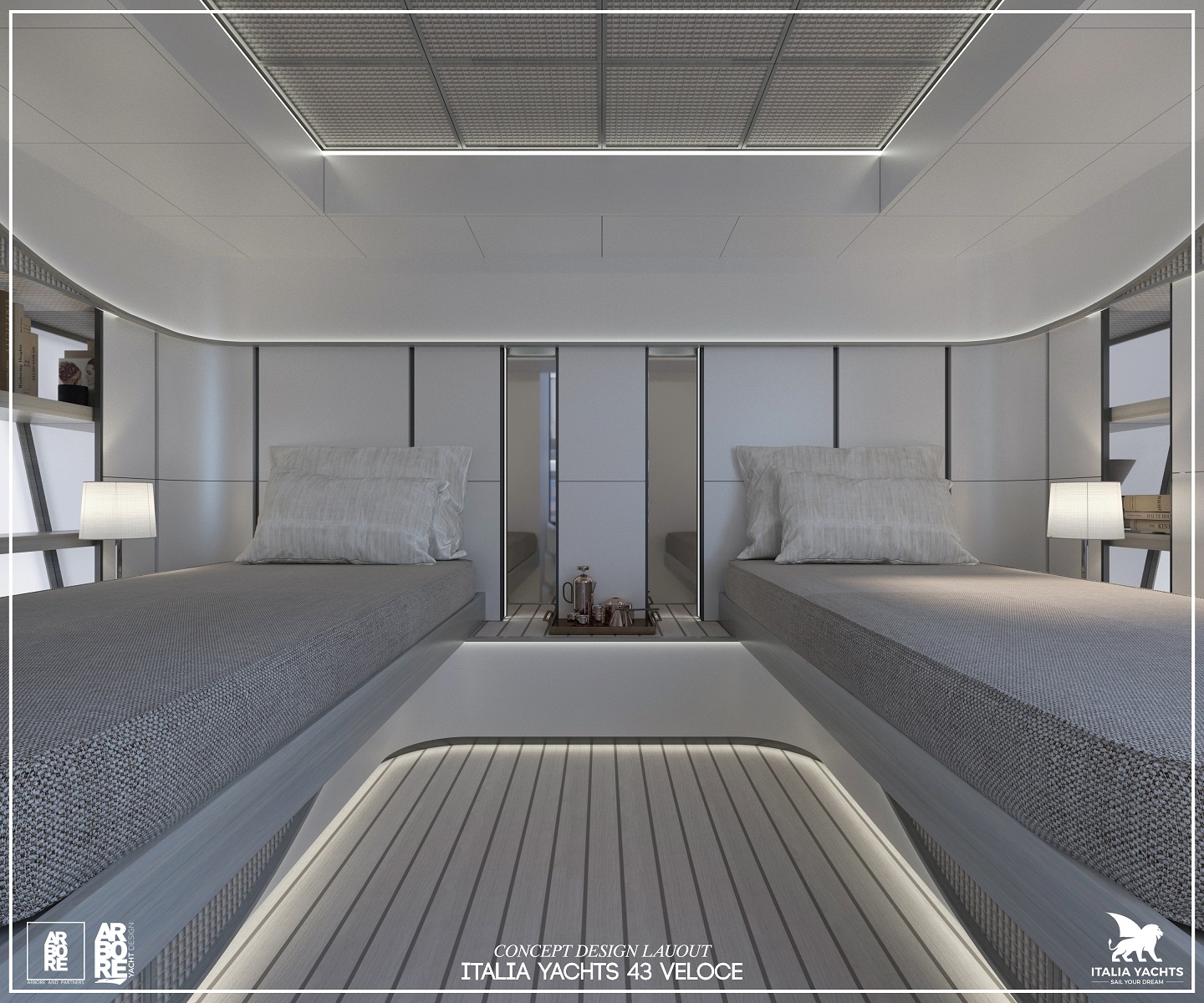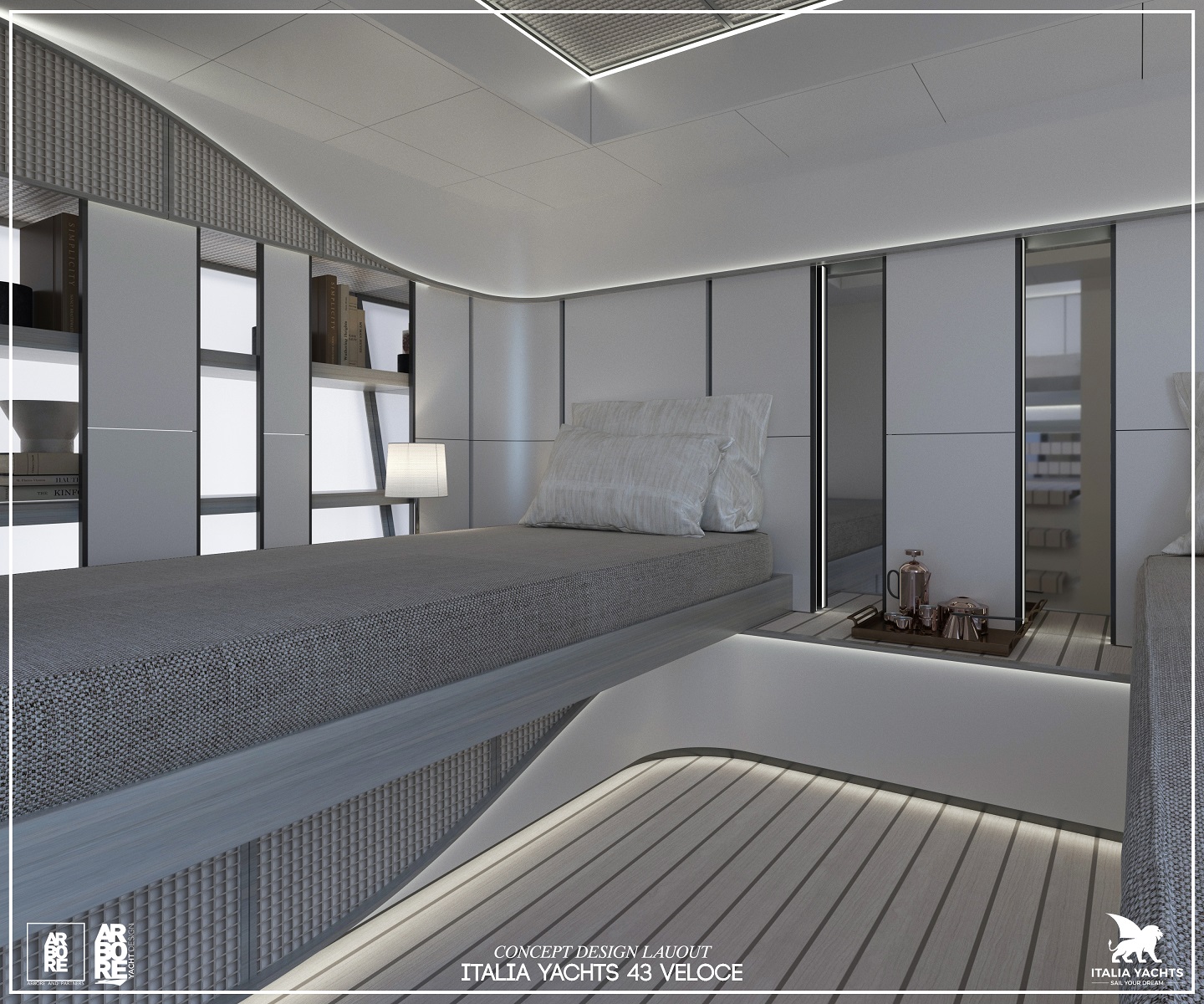 Blow deck, the IY 43 Veloce lives up to expectations, maintaining the modern elegance and clean lines that are characteristic of all Italia Yachts. The interior layout allows for a choice between a master cabin in the bow and twin beds in the full-beam mid-ship cabin, two cabins with double beds, or a full-beam mid-ship master cabin and a large living area with a table and wrap-around seating in the bow. These options provide vast possibilities for the IY 43, including use as a mega yacht tender. The interior shades come in two different solutions and mood boards directed towards two profiles: more delicate and sporty, both elegant, pleasing to the eye and touch.