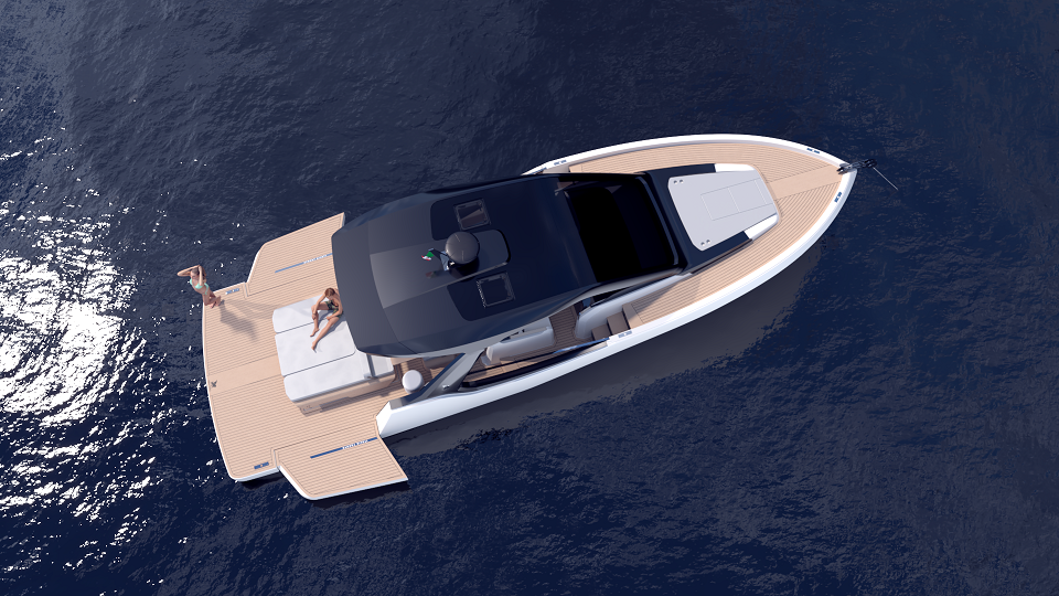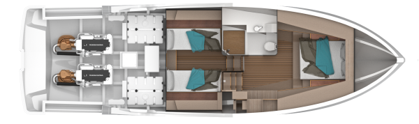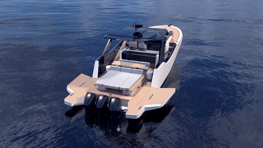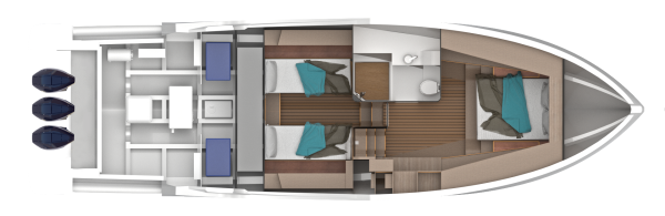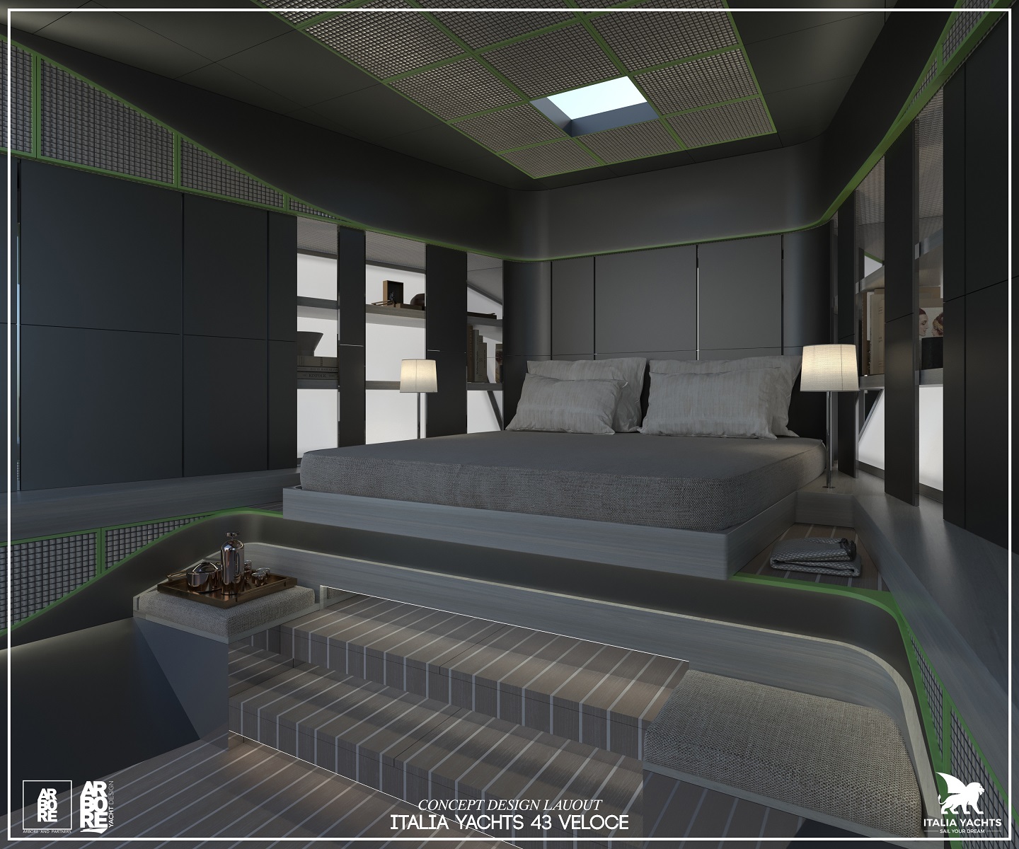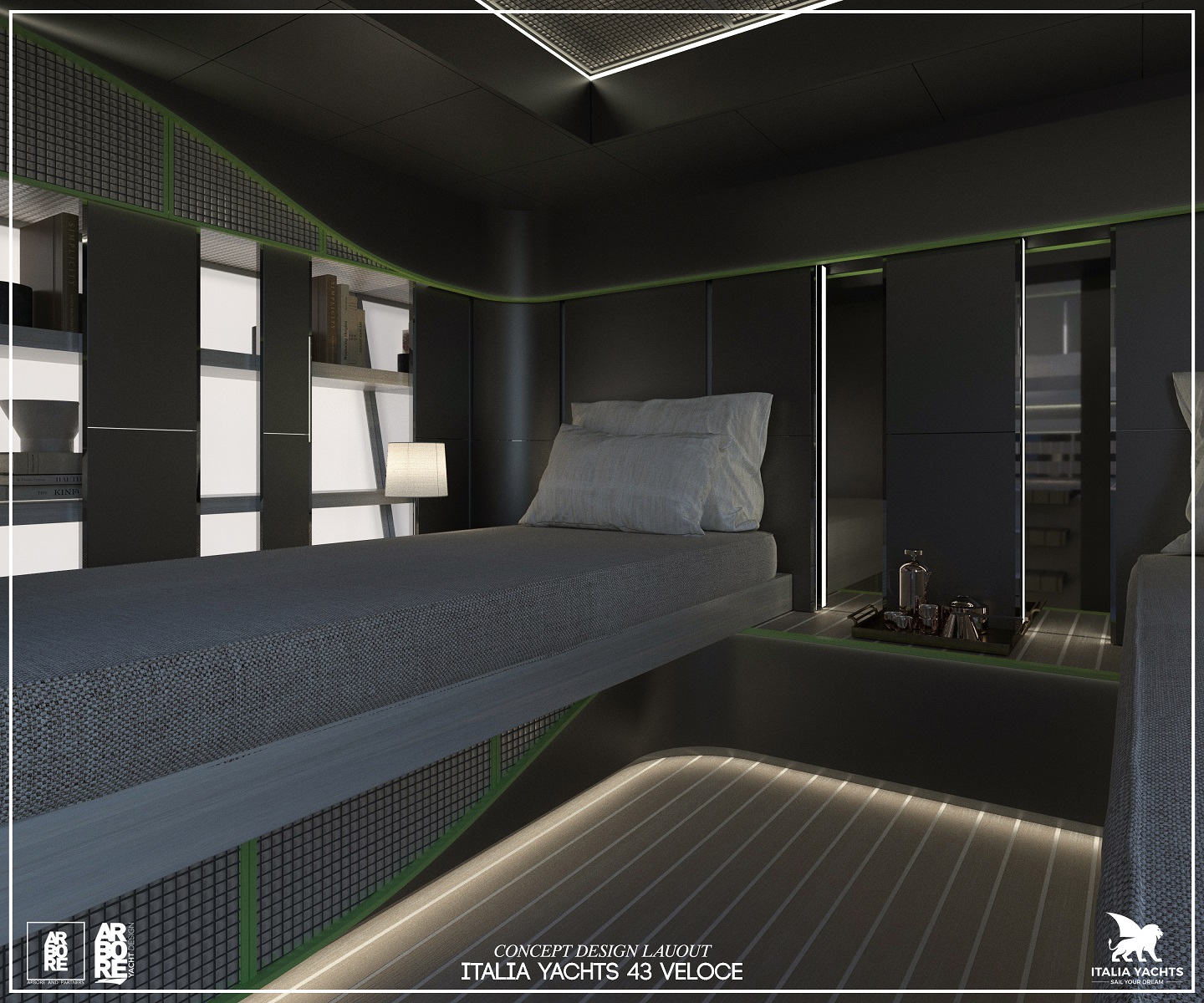 Blow deck, the IY 43 Veloce lives up to expectations, maintaining the modern elegance and clean lines that are characteristic of all Italia Yachts. The interior layout allows for a choice between a master cabin in the bow and twin beds in the full-beam mid-ship cabin, two cabins with double beds, or a full-beam mid-ship master cabin and a large living area with a table and wrap-around seating in the bow. These options provide vast possibilities for the IY 43, including use as a mega yacht tender. The interior shades come in two different solutions and mood boards directed towards two profiles: more delicate and sporty, both elegant, pleasing to the eye and touch.